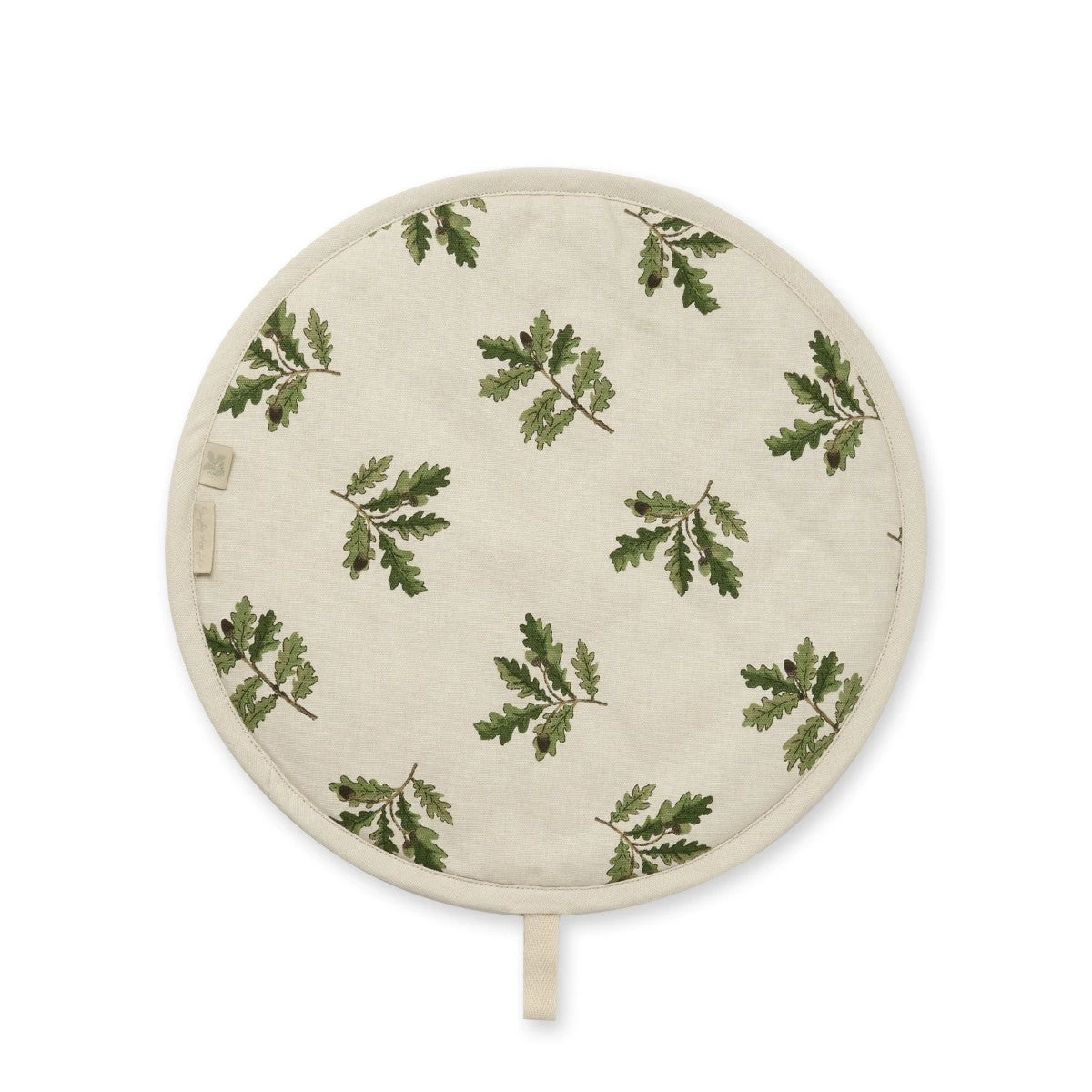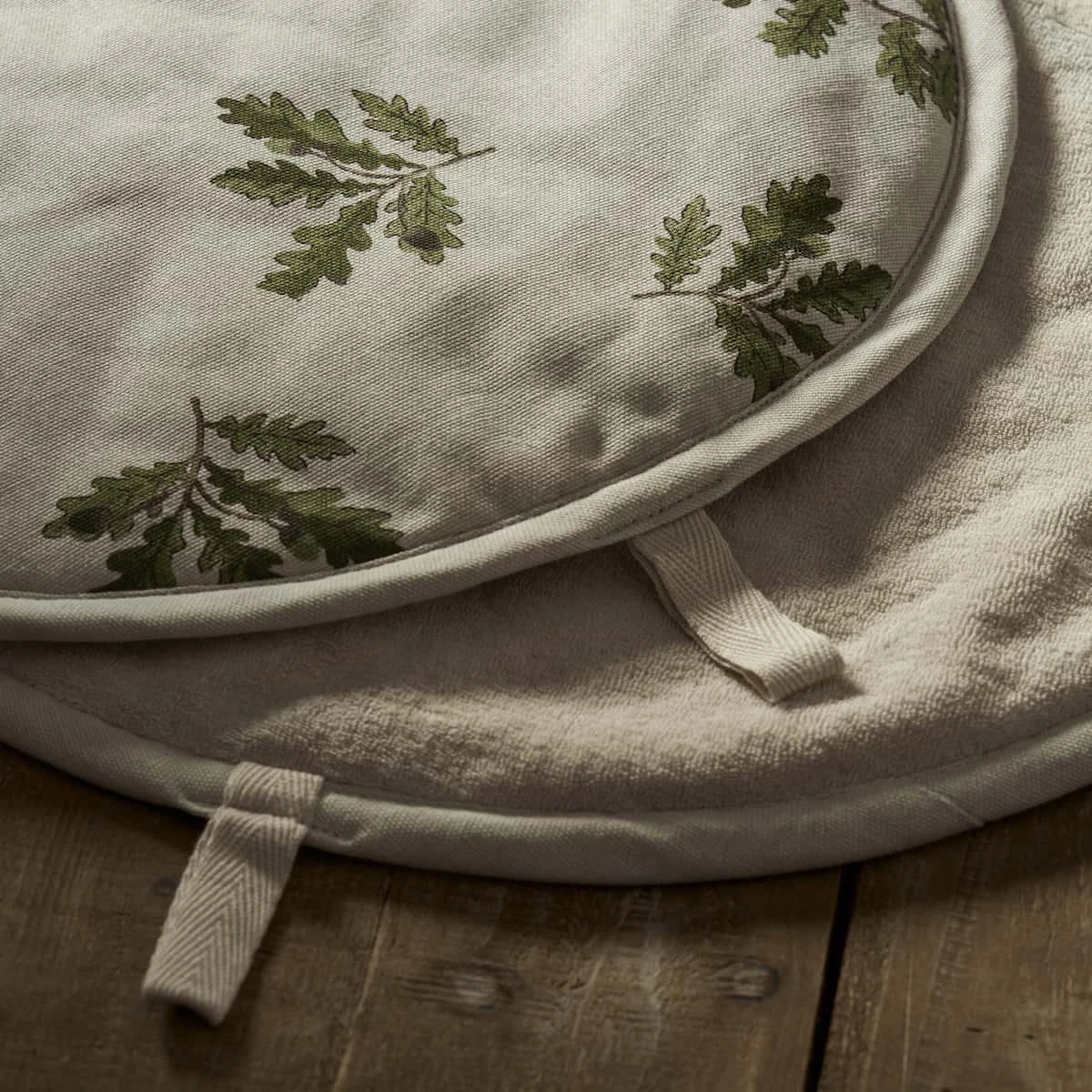 This elegant and timeless hob cover is sure to add a stylish touch of nature to your kitchen with its statement autumnal pattern. Featuring Sophie’s hand painted acorn and oak leaf motif on a soft neutral ground, it is the perfect choice for keeping your prized cooking stove hobs clean and scratch-free! Made from 100% cotton with a terry towelling base, this round hob cover features a handy loop, so it can be easily attached to the handle on your stove. We don’t recommend placing piping hot pans directly onto the cover.