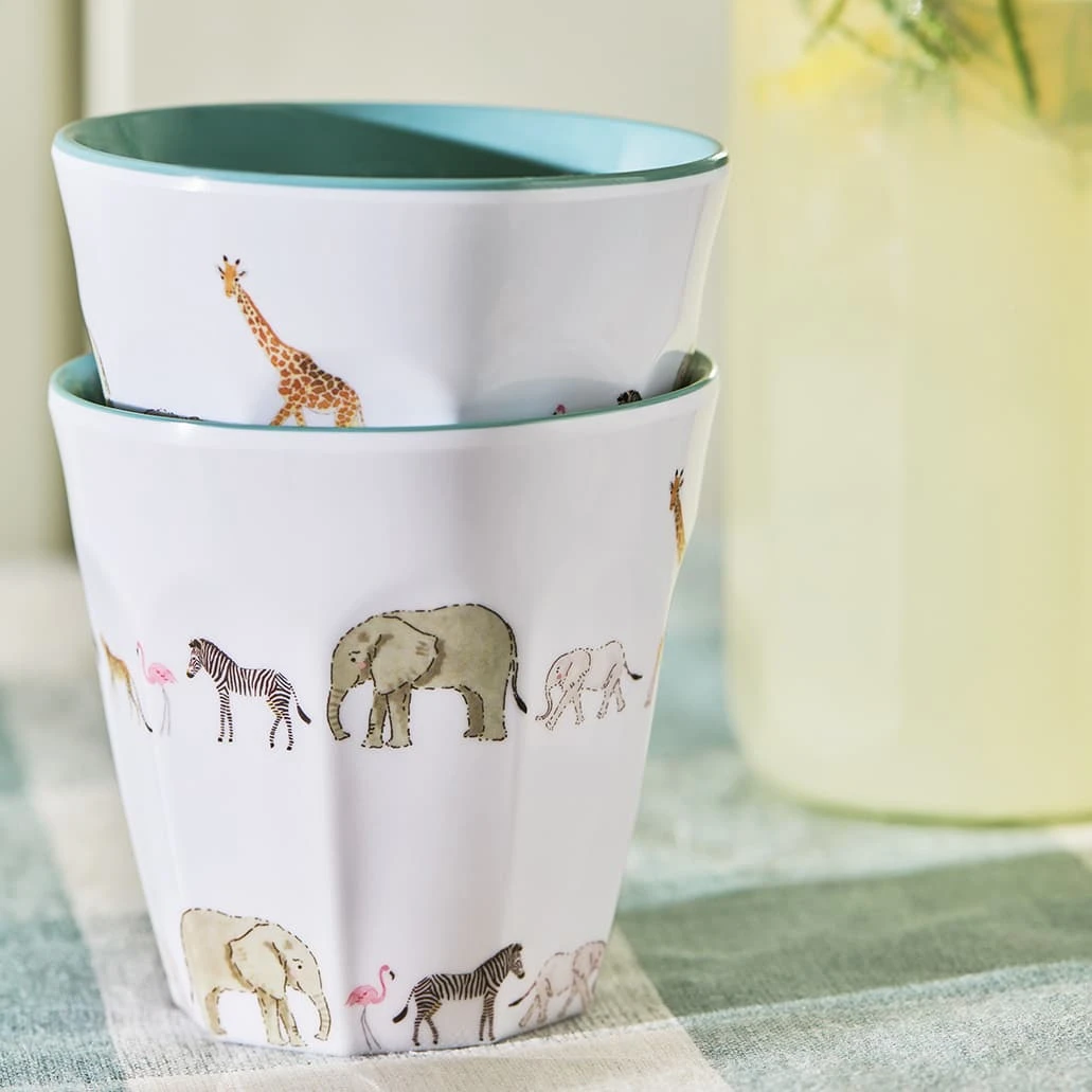 An adorable and classic summer essential, this lovely melamine beaker is perfect for picnics in the park, beach trips, BBQs, and outdoor entertaining. Featuring Sophie’s delicate illustrations of giraffes, elephants, cheetahs, zebras, and flamingos on a white ground with a contrasting duck egg inner.