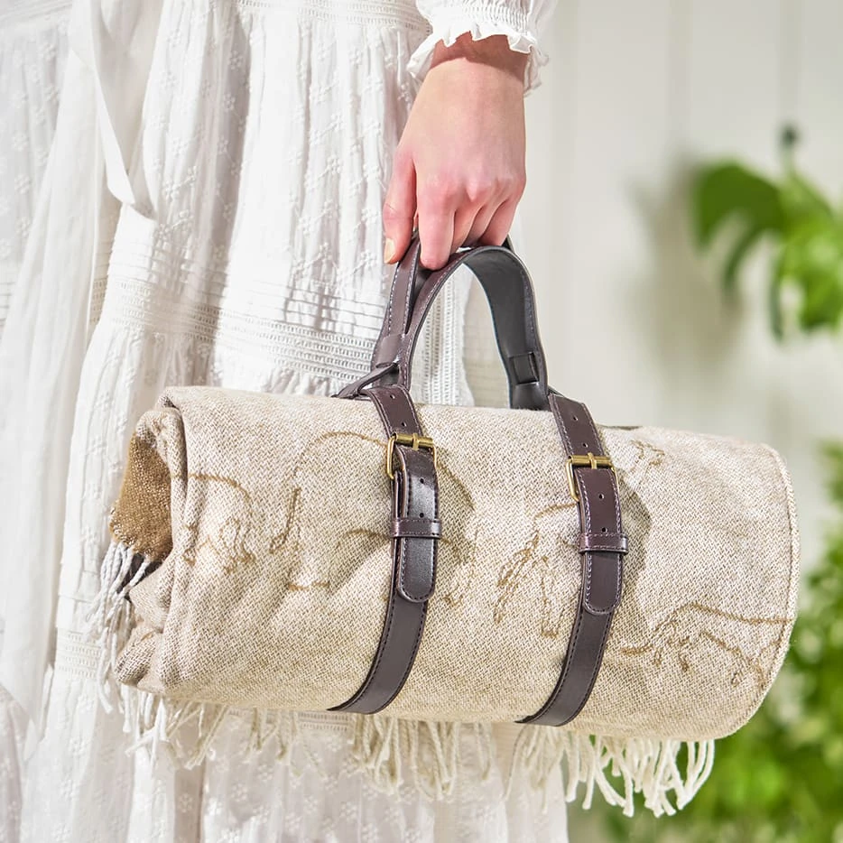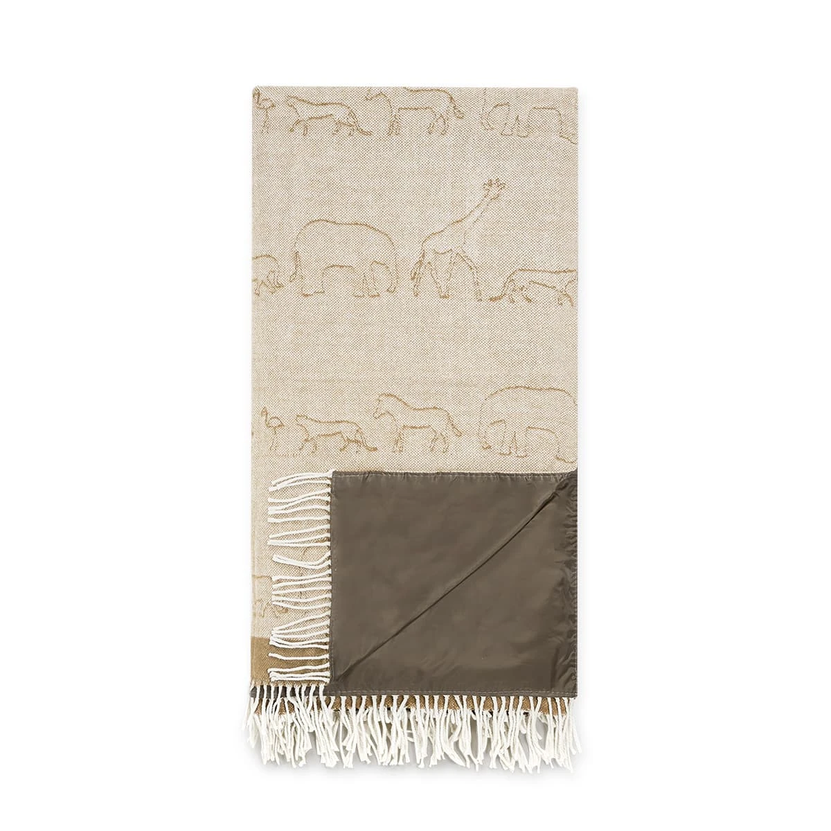 Add an adorable and classic touch to picnics in the park, beach trips, BBQs, and alfresco dining amongst friends with our inspiring Animals of the Savannah collection. A charming yet stylish summer essential, this practical picnic blanket is perfect for picnics in the park, beach trips, BBQs, and outdoor entertaining. Featuring Sophie’s delicate outlines of giraffes, elephants, cheetahs, zebras, and flamingos on a neutral ground with caramel edges, it is a fabulous choice for family days out or taking a snooze in the sun. The faux brown leather straps make it easy to carry around, whilst the brown water-resistant backing is perfect for keeping you and your belongings dry if the ground is wet.