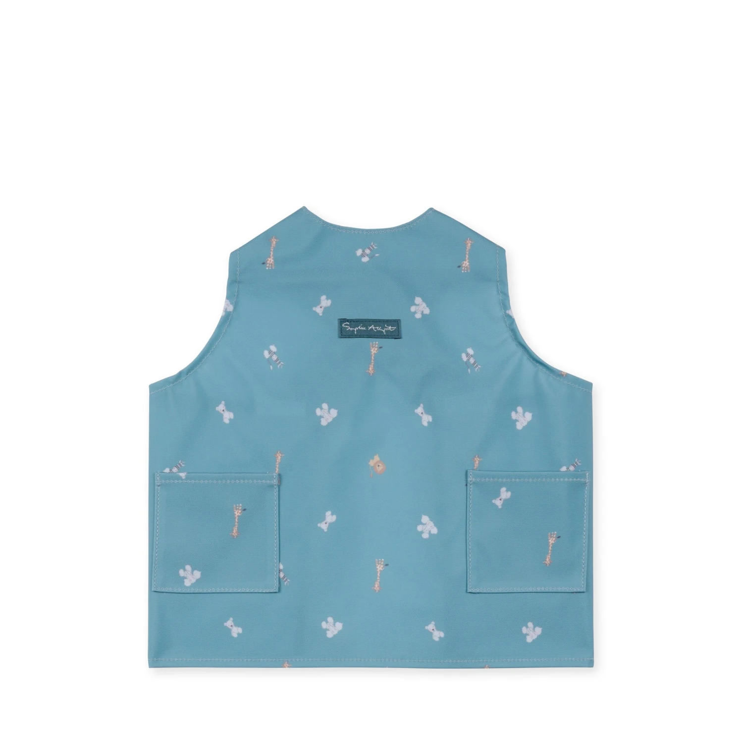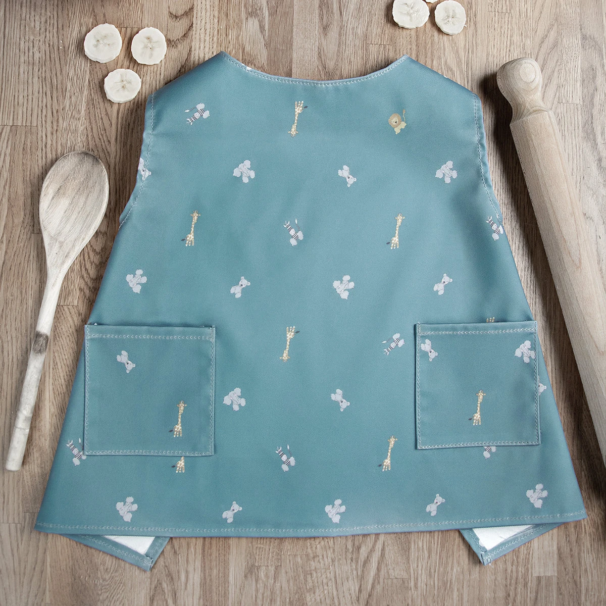This adorable apron is perfect for younger children and toddlers and is covered in cute teddy bears, giraffes, lions and zebras on a sky blue background. This child coverall makes an excellent feeding bib to protect their clothes from any mess or an excellent playtime apron. There are two practical pockets and there is a cross back strap design, meaning you don’t have to mess about with any ties.