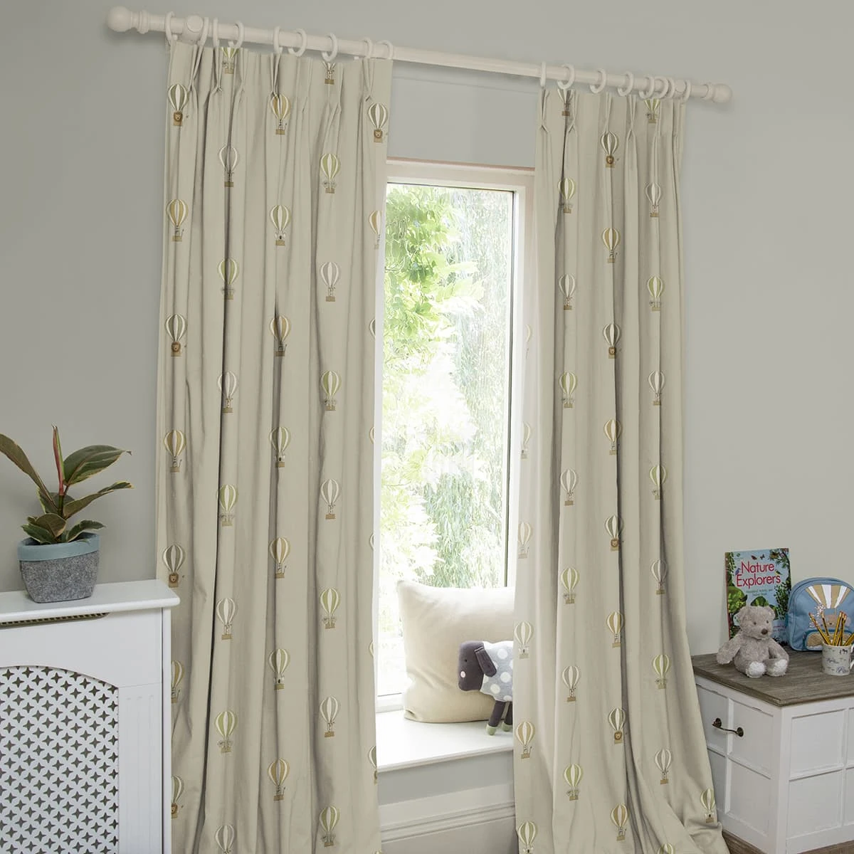 These lovely made to measure curtains are sure to add an adorable touch to any children’s bedroom, nursery, or playroom. Covered in Sophie’s Bears & Balloons design with cute animals including giraffes, elephants, lions, zebras, and koalas floating away in hot air balloons on a sand coloured background.