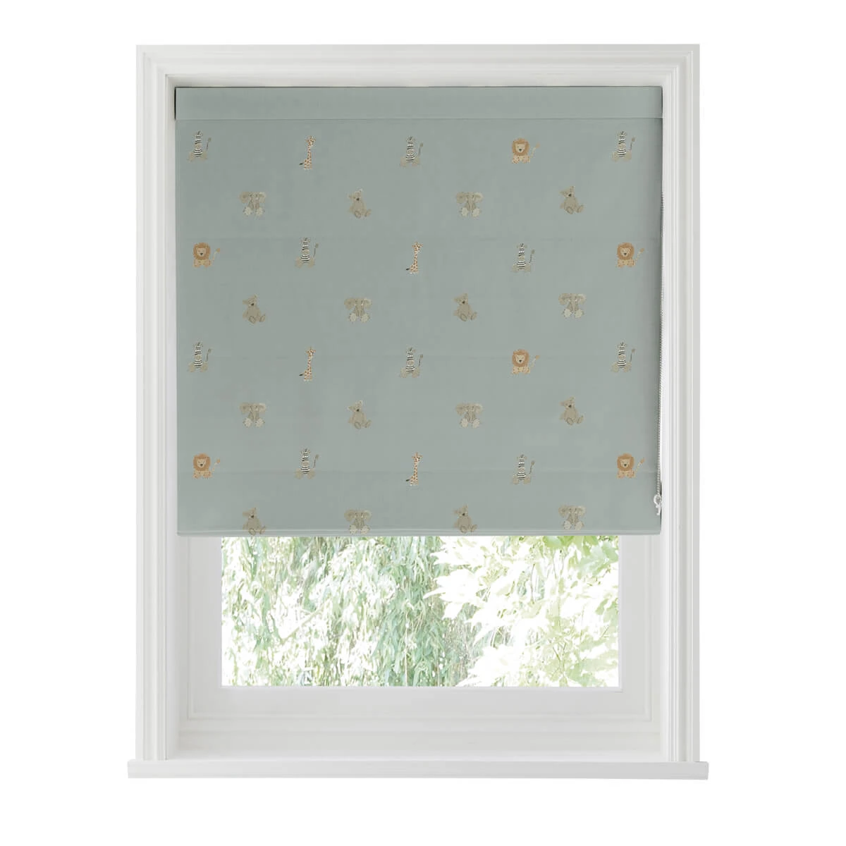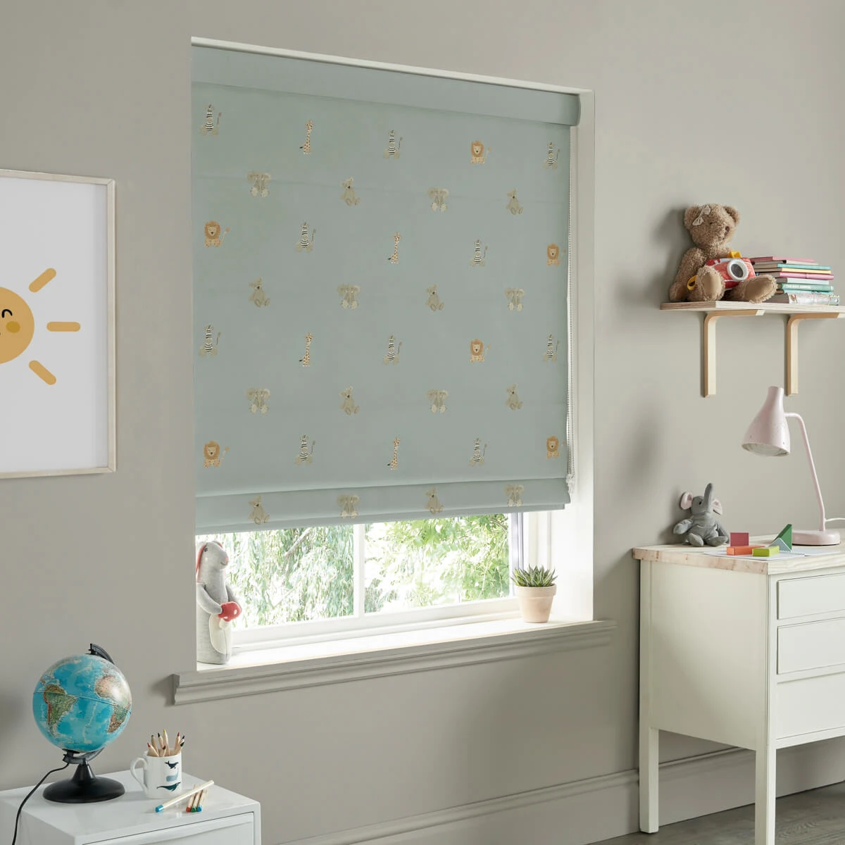 Excellent for blocking the light when they go down for a daytime nap or evening snooze. Perfect for children’s rooms or nurseries, this adorable roman blind features Sophie’s Bears & Balloons design, which is covered in safari animals with cute giraffes, lions, zebras and teddy bears on a sage green ground.