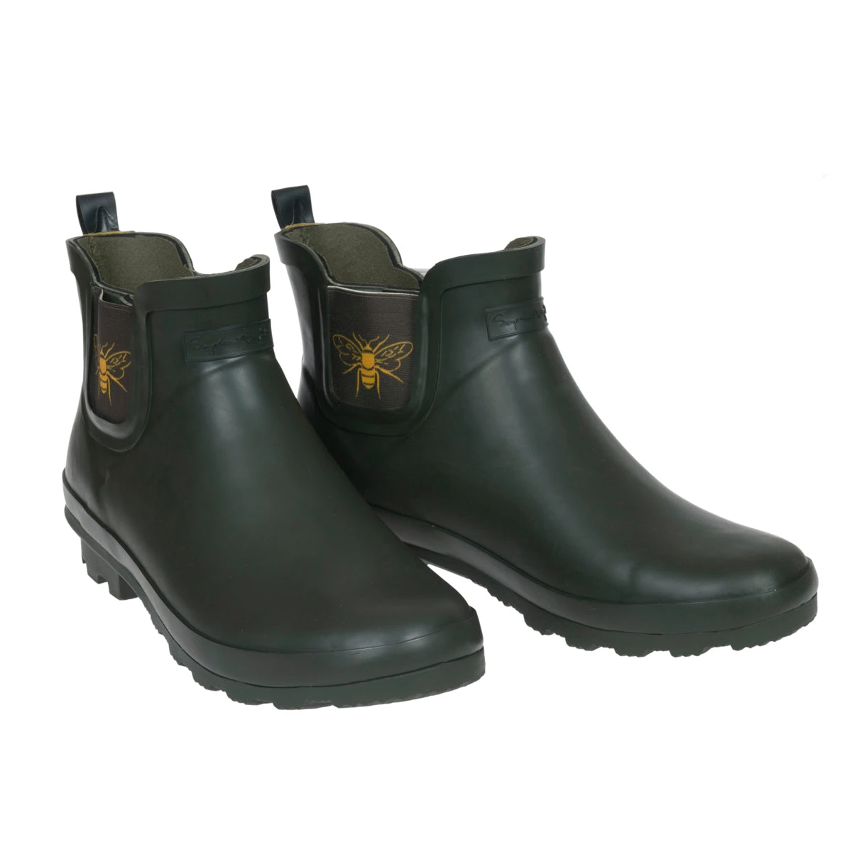 These wellington ankle boots are both practical and stylish, perfect for outdoor adventures, rainy wet days and when you are out and about in the garden. Made from a dark green rubber, they are sure to keep your feet dry and feature Sophie’s beautiful bee on the ankle!
