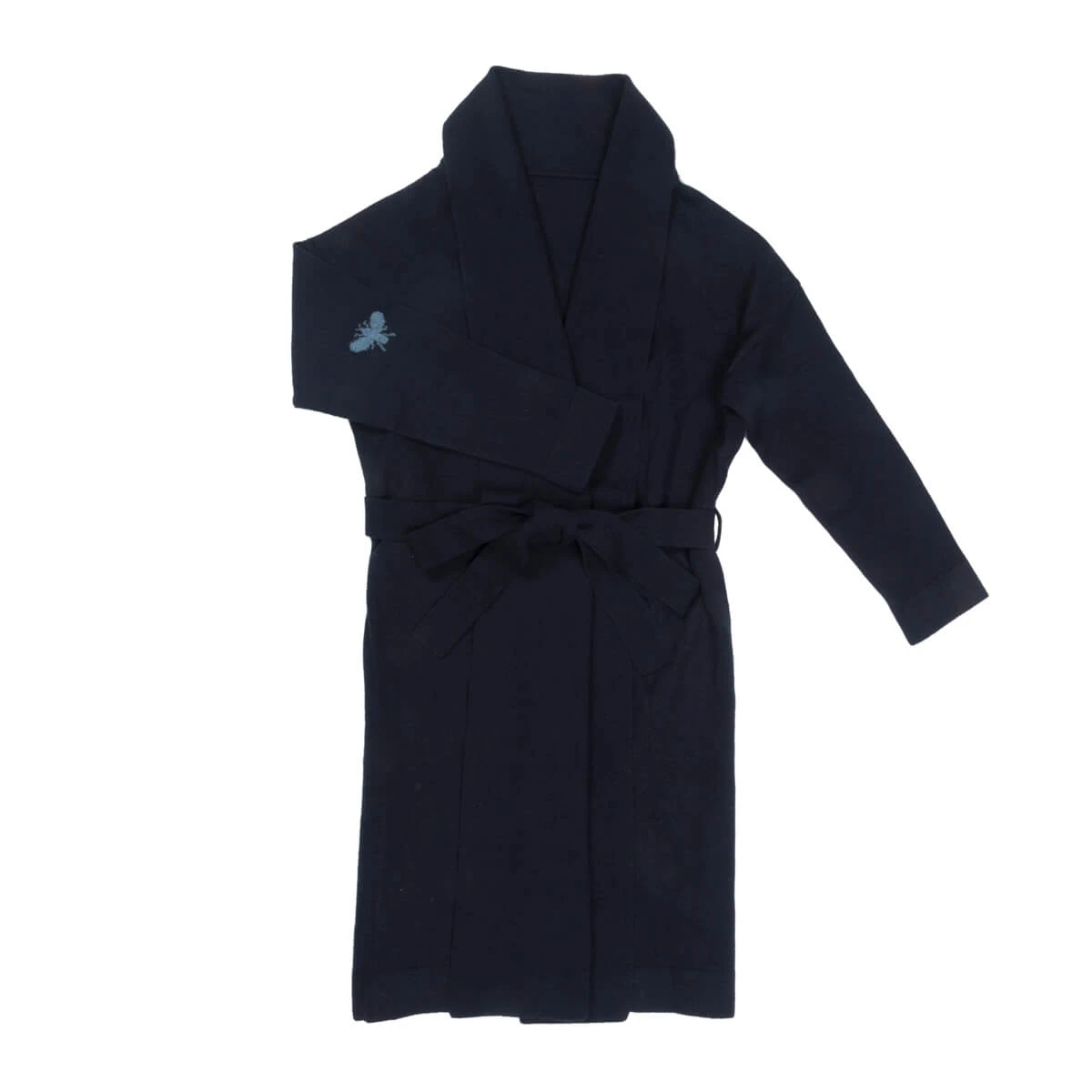 Made from 100% pure cashmere, this luxurious dark navy robe is incredibly soft and is perfectly elegant! Excellent for relaxing and layering over loungewear or nightwear for an indulgent feel. This robe is complete with Sophie’s bee detailing on the elbows and a matching tie belt.