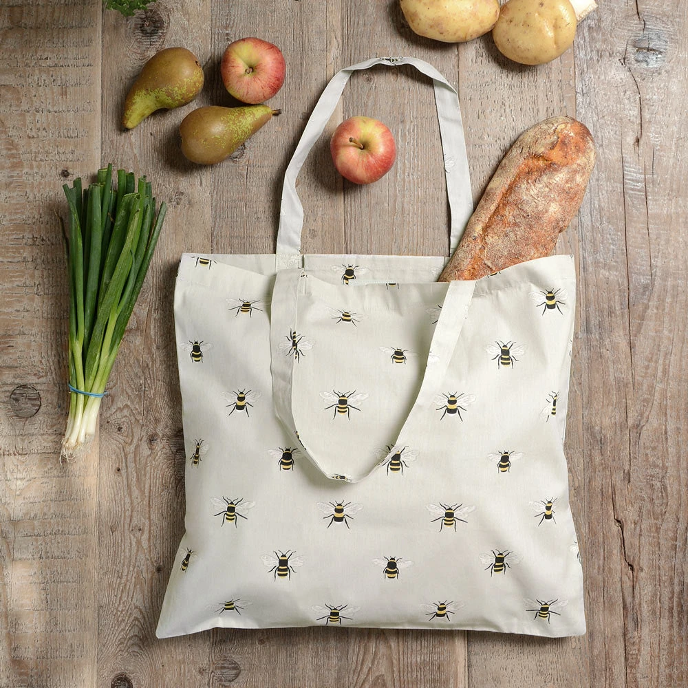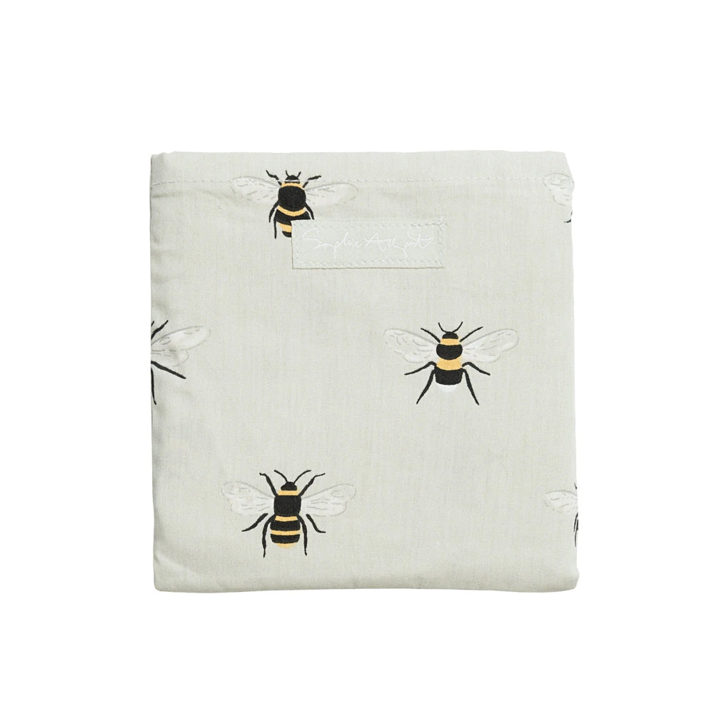 This ingenious shopping bag conveniently folds neatly into the internal pocket and is covered in stylish bees, on a pale green background.
