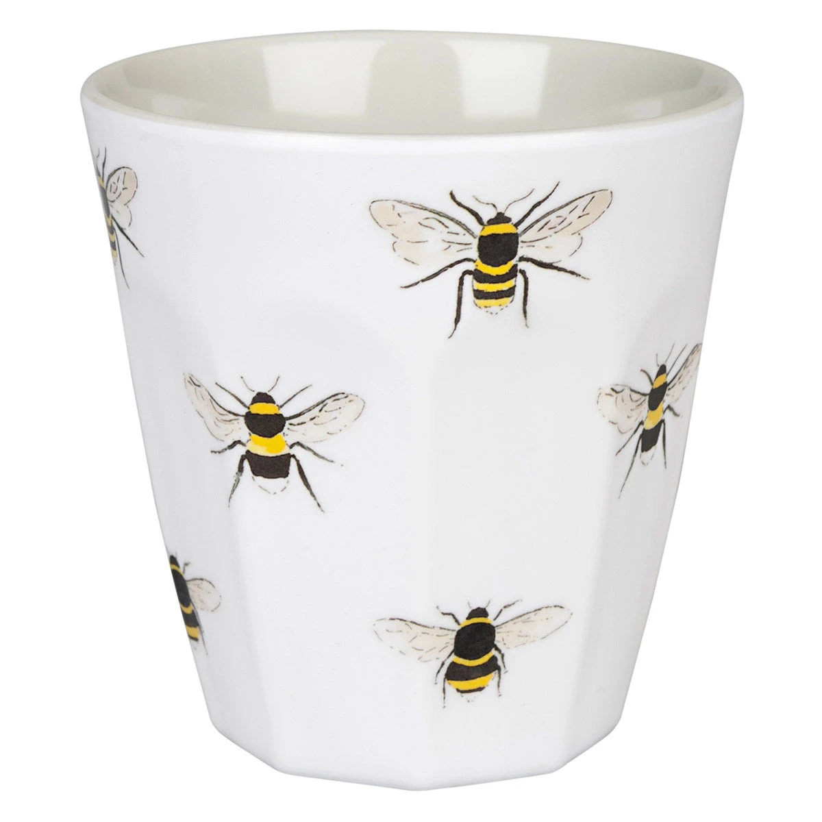 This melamine cup is perfect for outdoor summer picnics and children at home. A lovely design covered in bees on a white beaker and a pale green inner.
