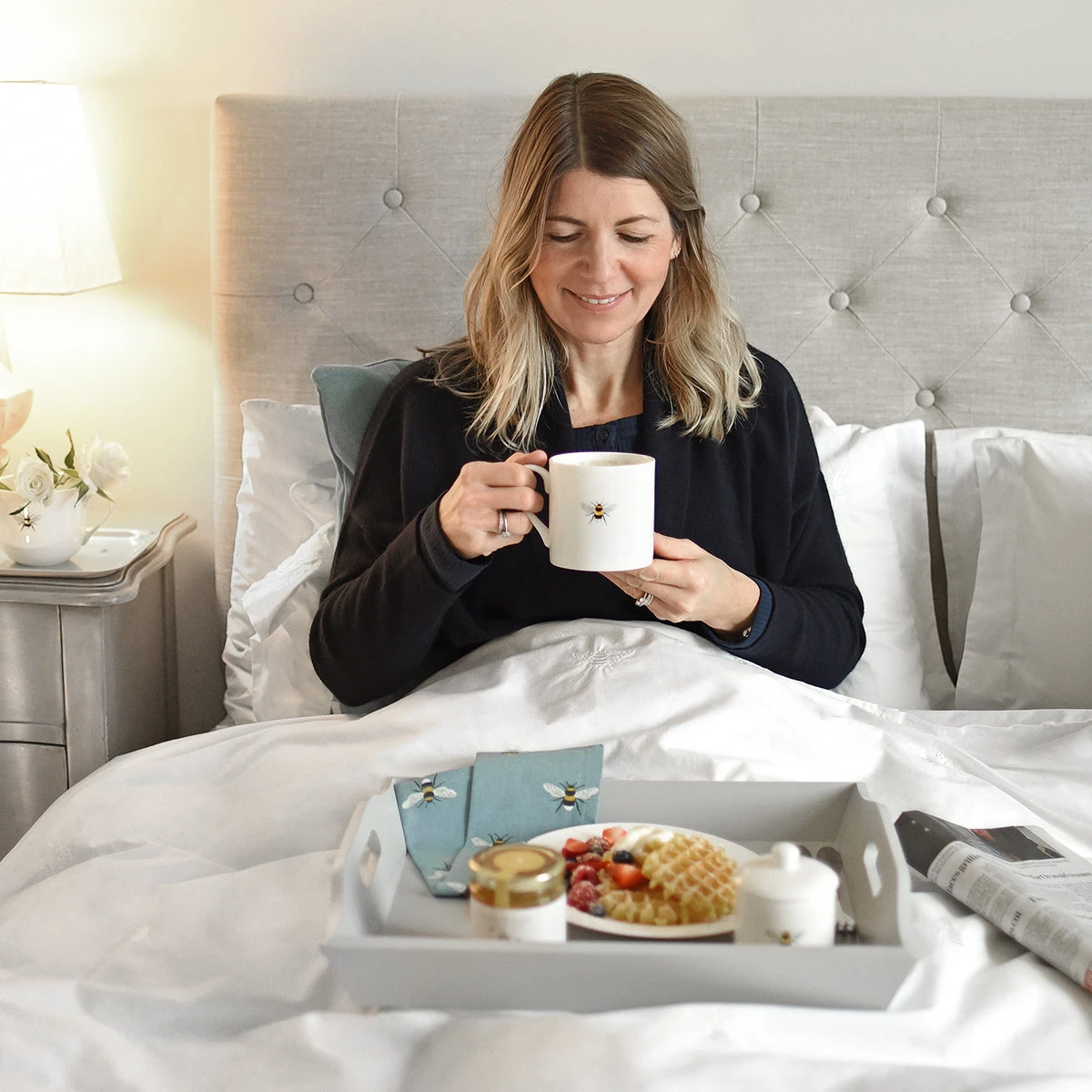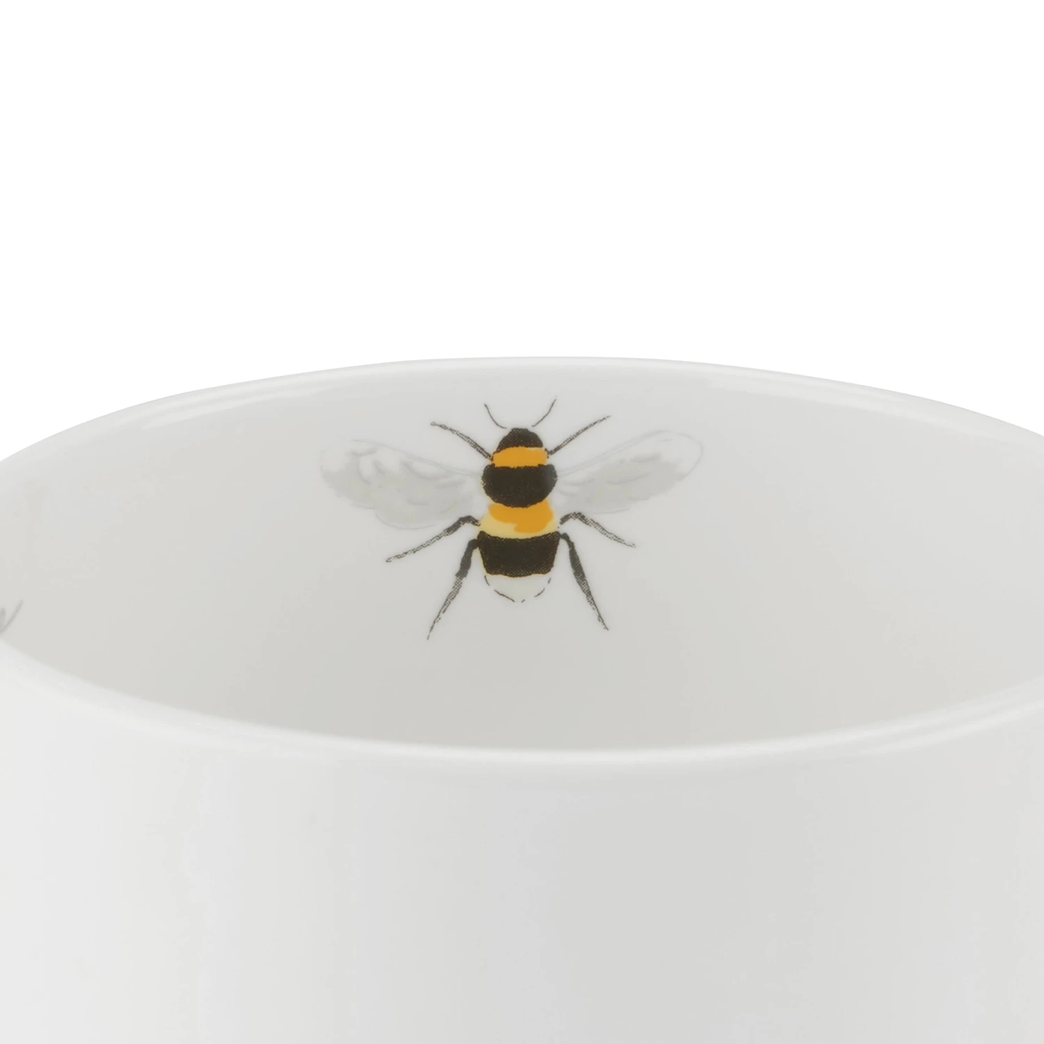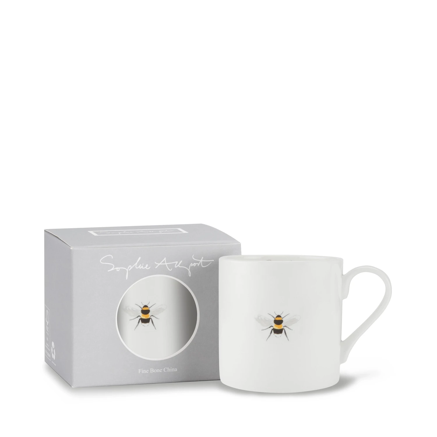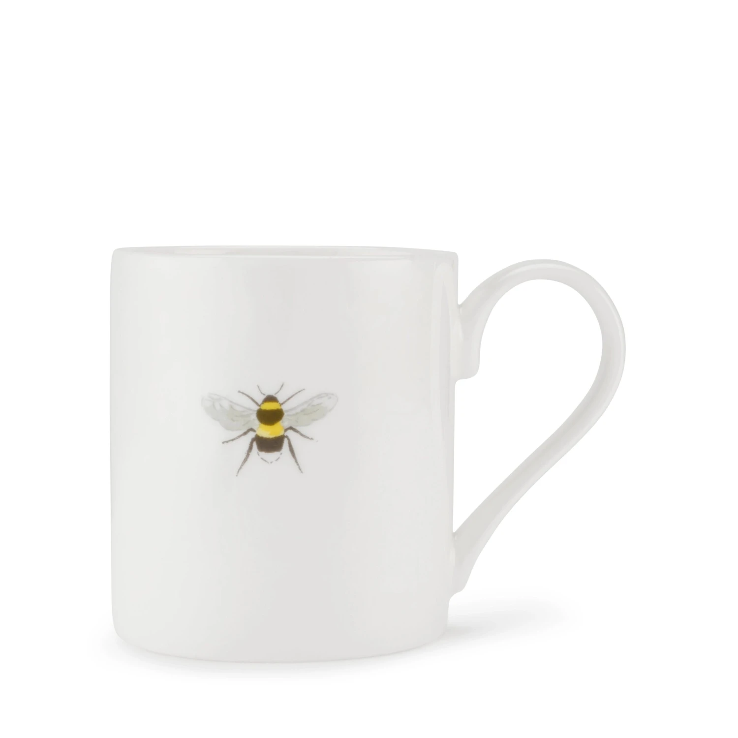 One bee sits on the front and back of this white fine bone china mug. A simple and stylish design.