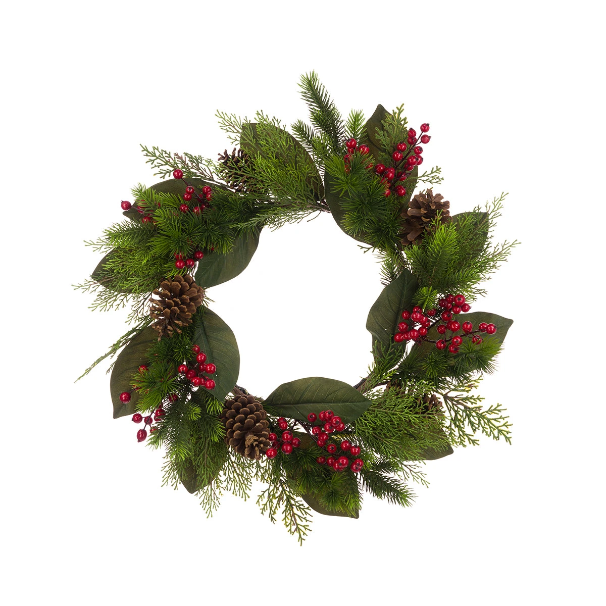 This beautiful faux berry and pinecone wreath has realistic looking leaves and foliage and is dotted with luxurious red berries and pine cones for a festive look. Excellent for hanging on your door or use as a centrepiece on your table setting with a vase in the centre.