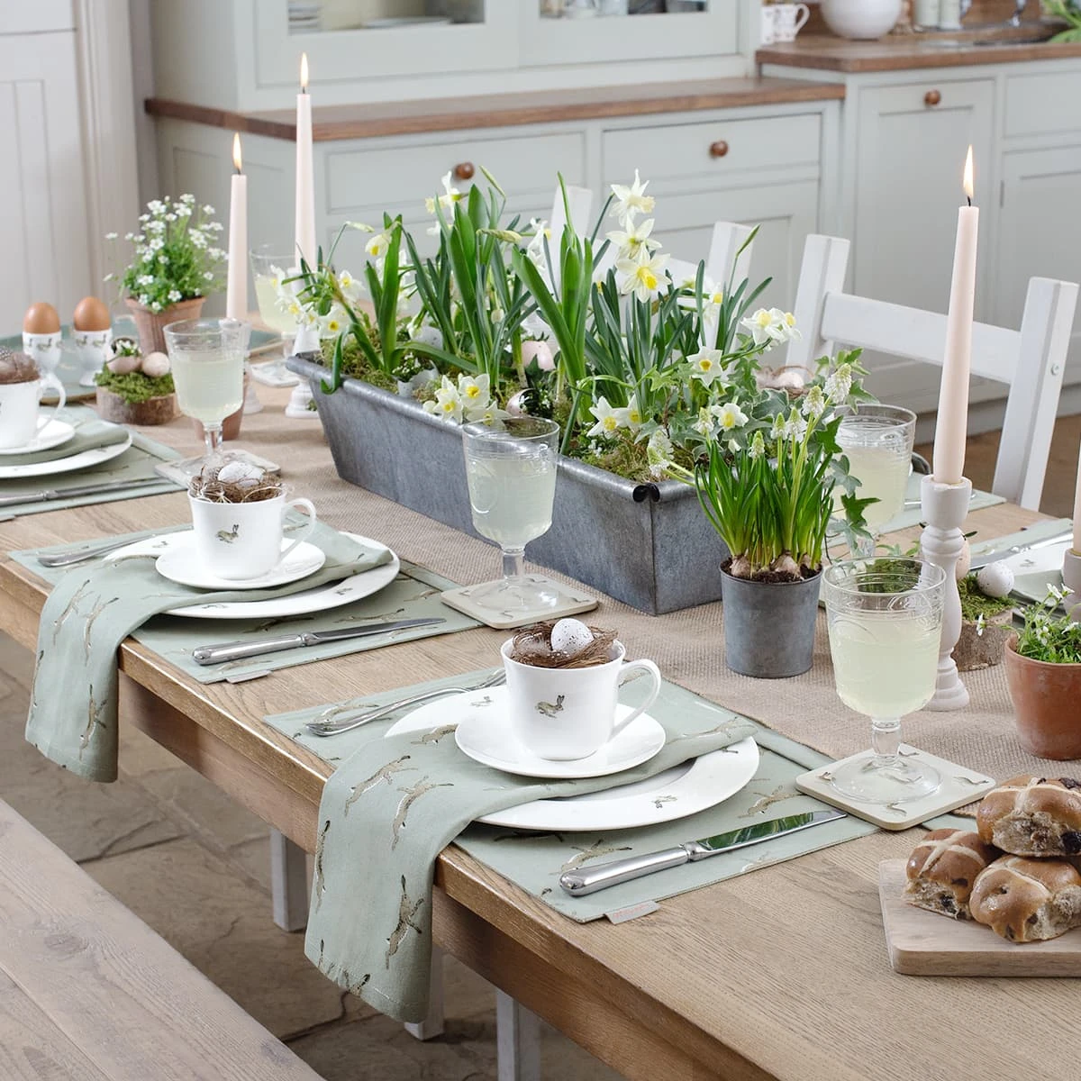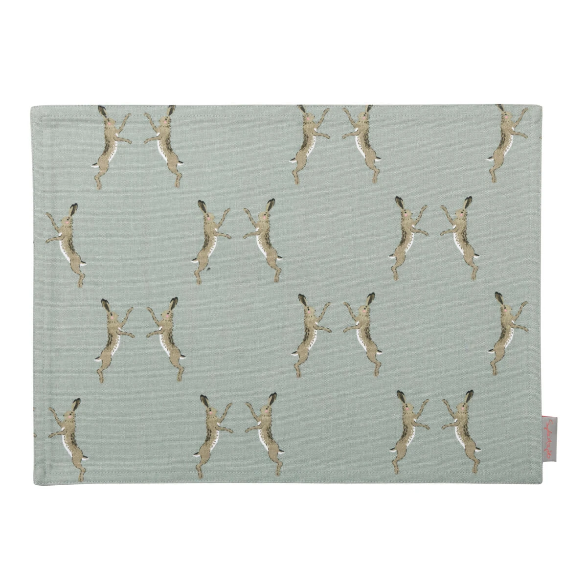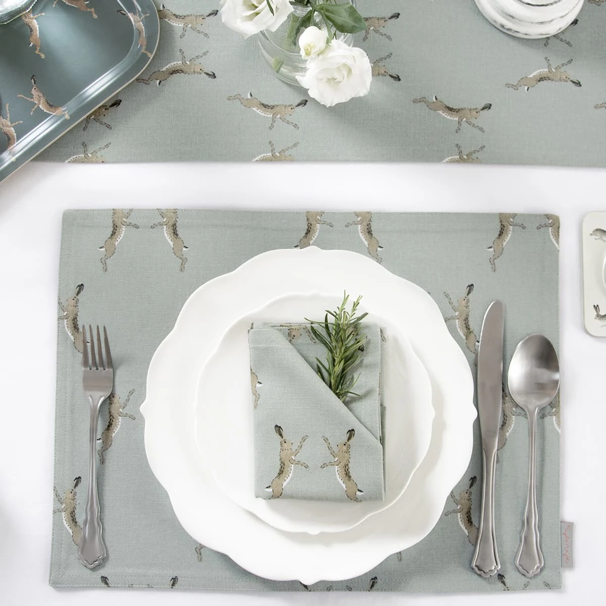 Add a stylish country look to your kitchen or dining table with these lovely duck egg grey fabric placemats. This charming design has captured the wildlife spectacle of boxing hares, which can be often seen during the spring months and is inspired by the hares seen in the fields close to Sophie’s home in rural Lincolnshire. Made from 100% cotton and sold as single, they are excellent for creating a tablescape and perfect for everyday dining or special family occasions.