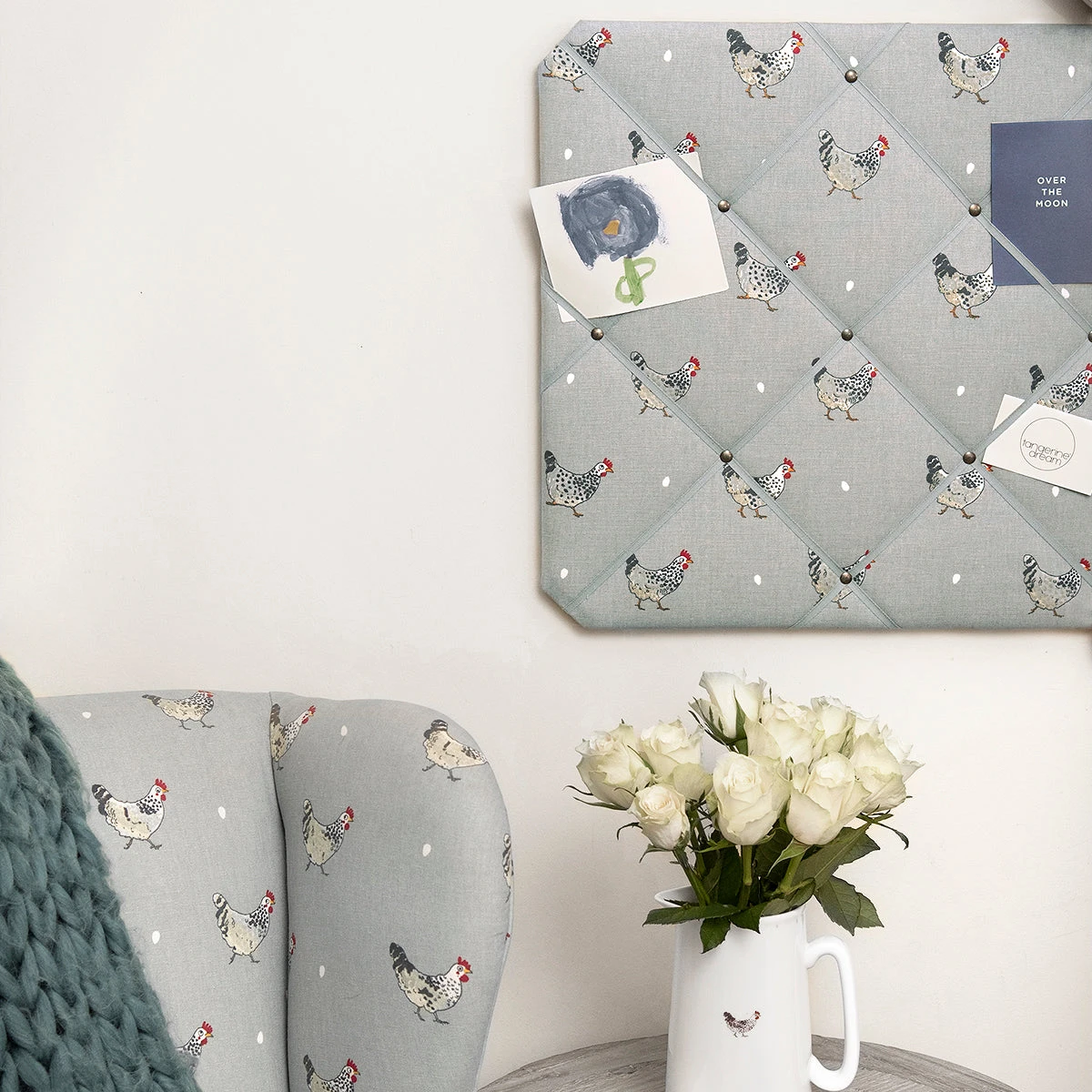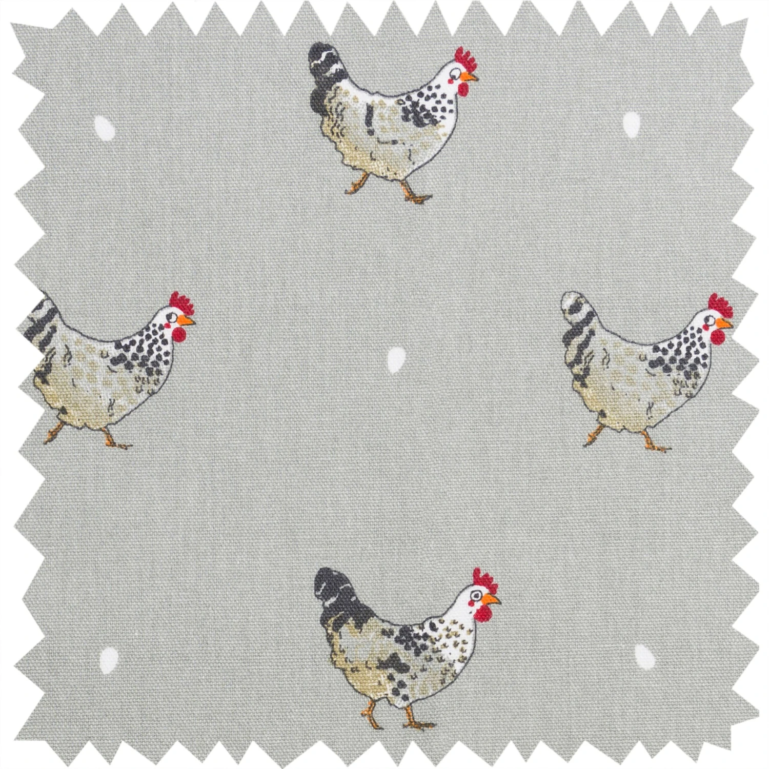 Our wonderful Chicken fabric is 100% cotton and can be bought ‘by the metre.’ This lovely design features Sophie’s illustrations of some quirky Speckled Maran hens that sit on a sage grey background with a few white eggs dotted around. Perfect for making your own tablecloths, curtains, cushions and blinds.