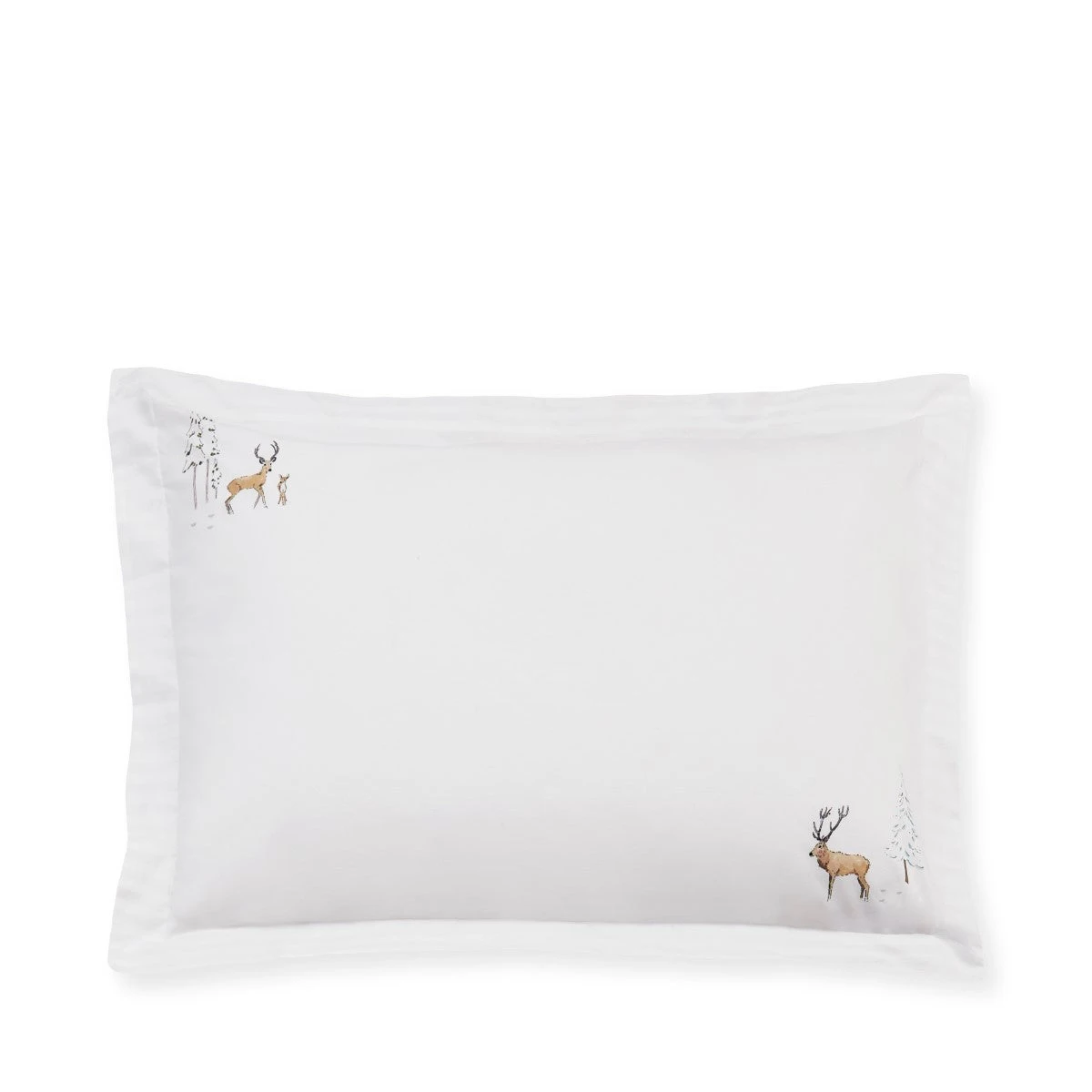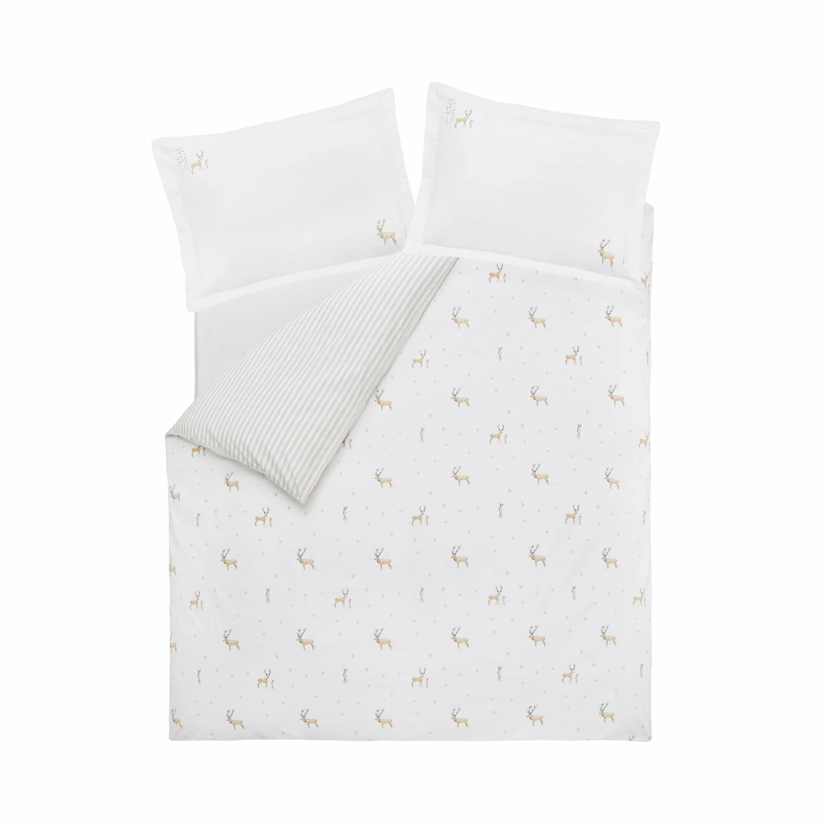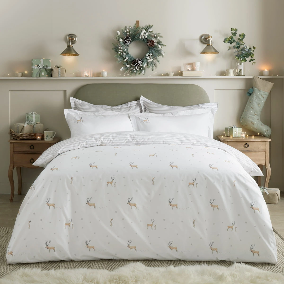 Add a touch of festive charm to your bedroom and curl-up in style on those cold winter nights with our reversible Christmas Stags Bedding Set. The set is made from 200 thread count 100% cotton, comes with matching pillowcases and is available in four sizes. The design features Sophie’s adorable illustrations of magnificent stags and fawns walking in the snow on a crisp white ground, with a soft grey horizontal stripe on the reverse.