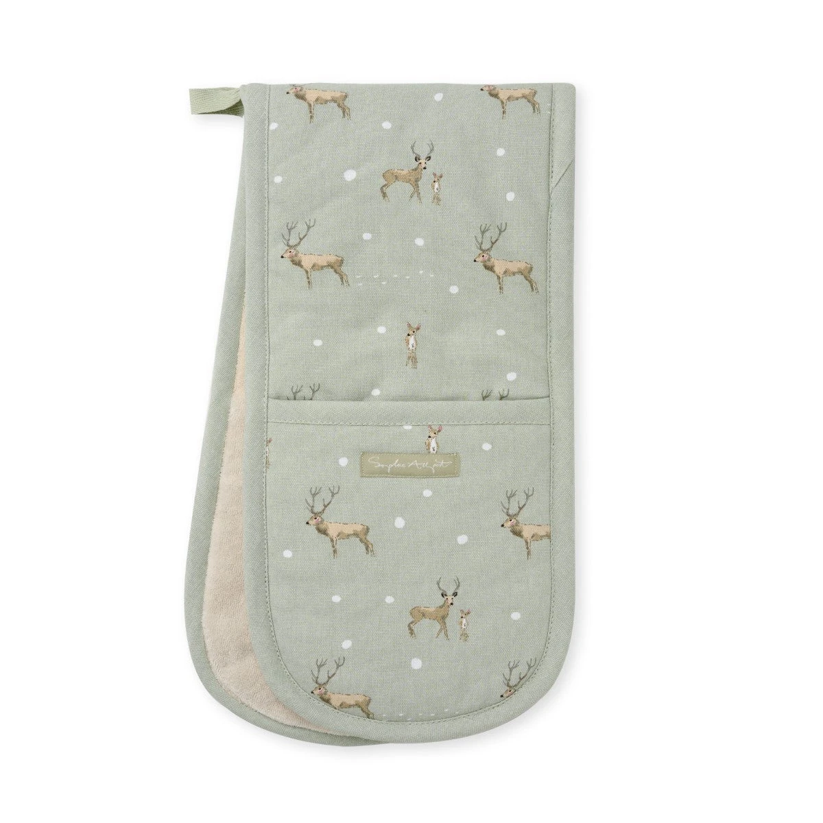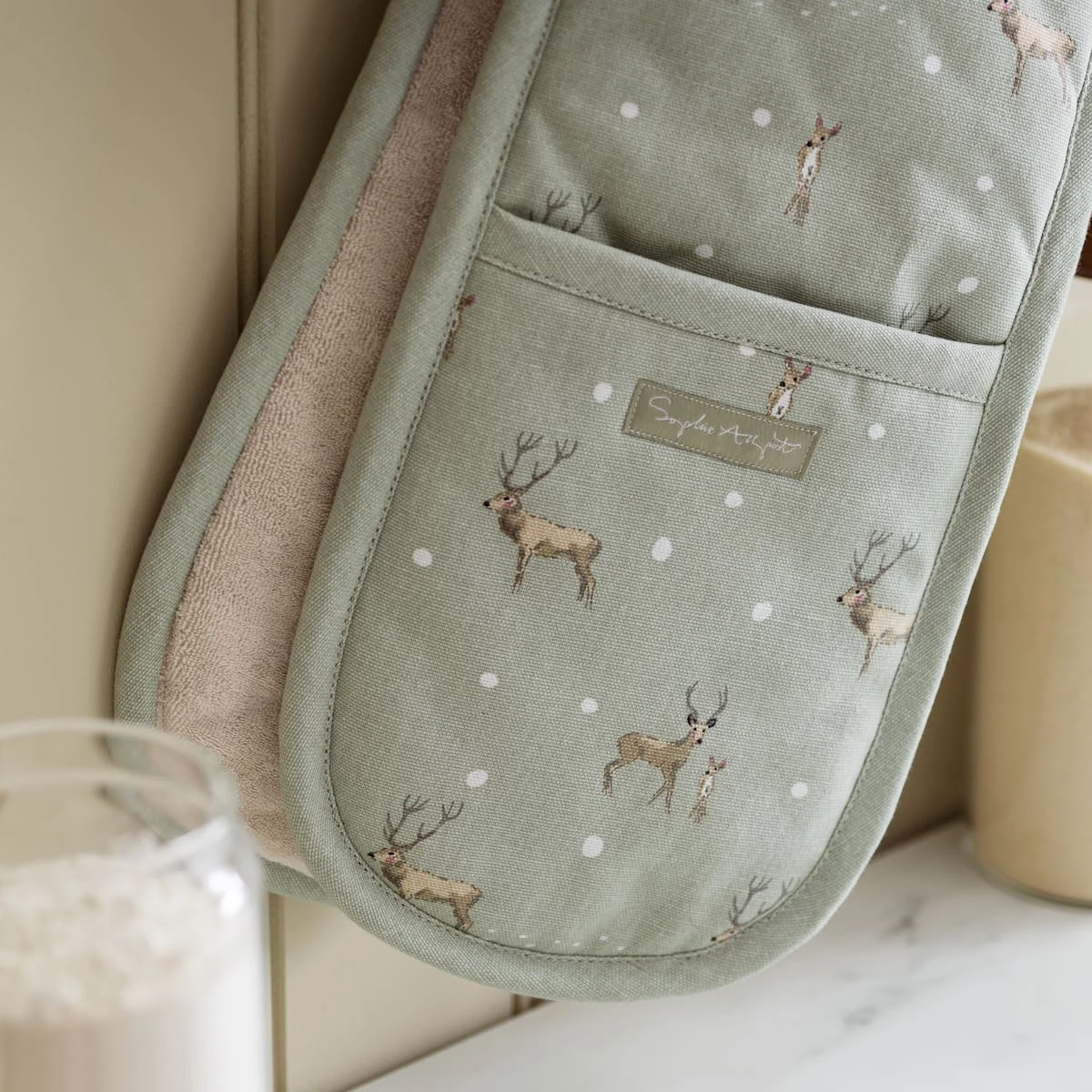 Protect your hands from hot pans with our stylish and practical double oven glove, printed with charming Christmas Stags. Featuring Sophie’s magnificent stags and adorable fawns in the snow on a warm grey ground with green undertones, these will add a lovely festive touch to any kitchen this Christmas. The reverse of the glove and inside each hand pocket has a polyester thermal layer for extra protection and there is also a handy ‘loop’ in the middle of the glove, so you can hang it up in your kitchen.