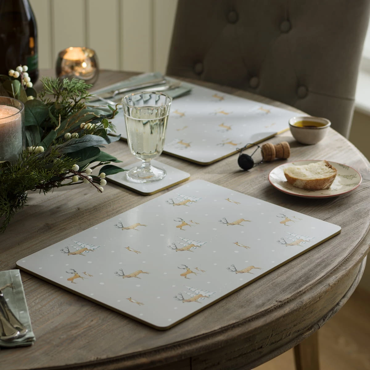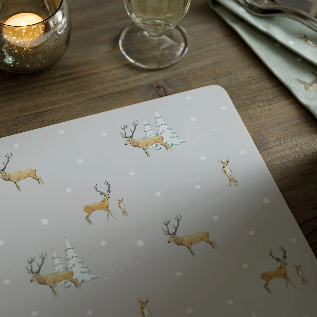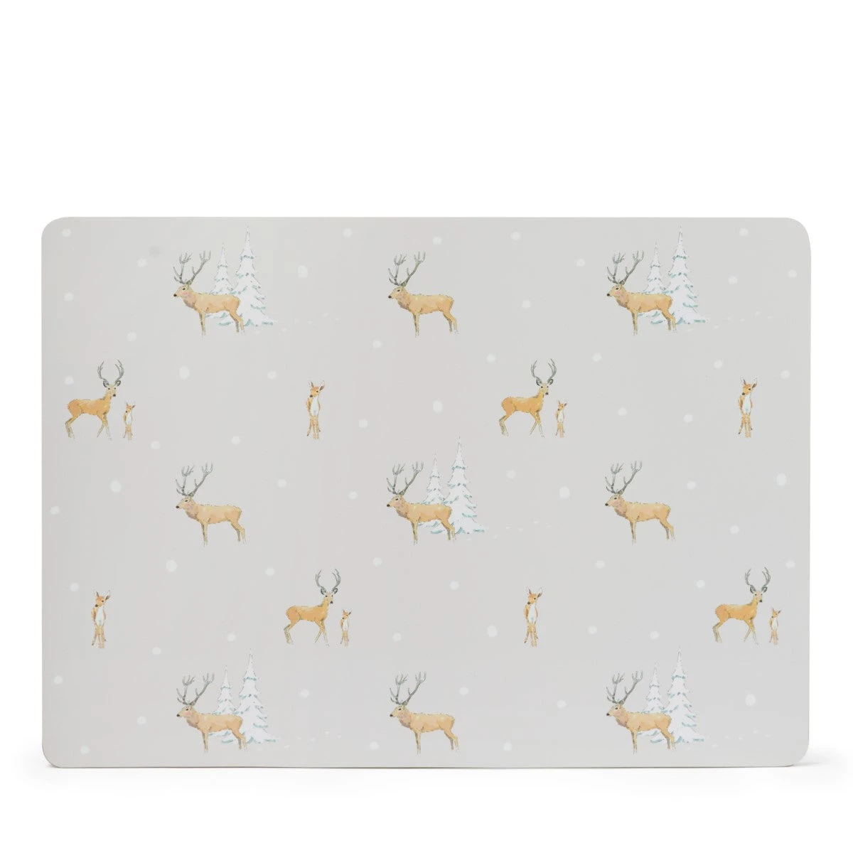 This set of two extra large cork placemats features our classic and timeless Christmas Stags design, featuring magnificent stags and adorable fawns in the snowy forest on a soft grey background with metallic gold painted edging. A practical and super stylish way to protect your table surface from stains, spillages, and water rings at meal times. We think they would make a lovely little Christmas gift too.