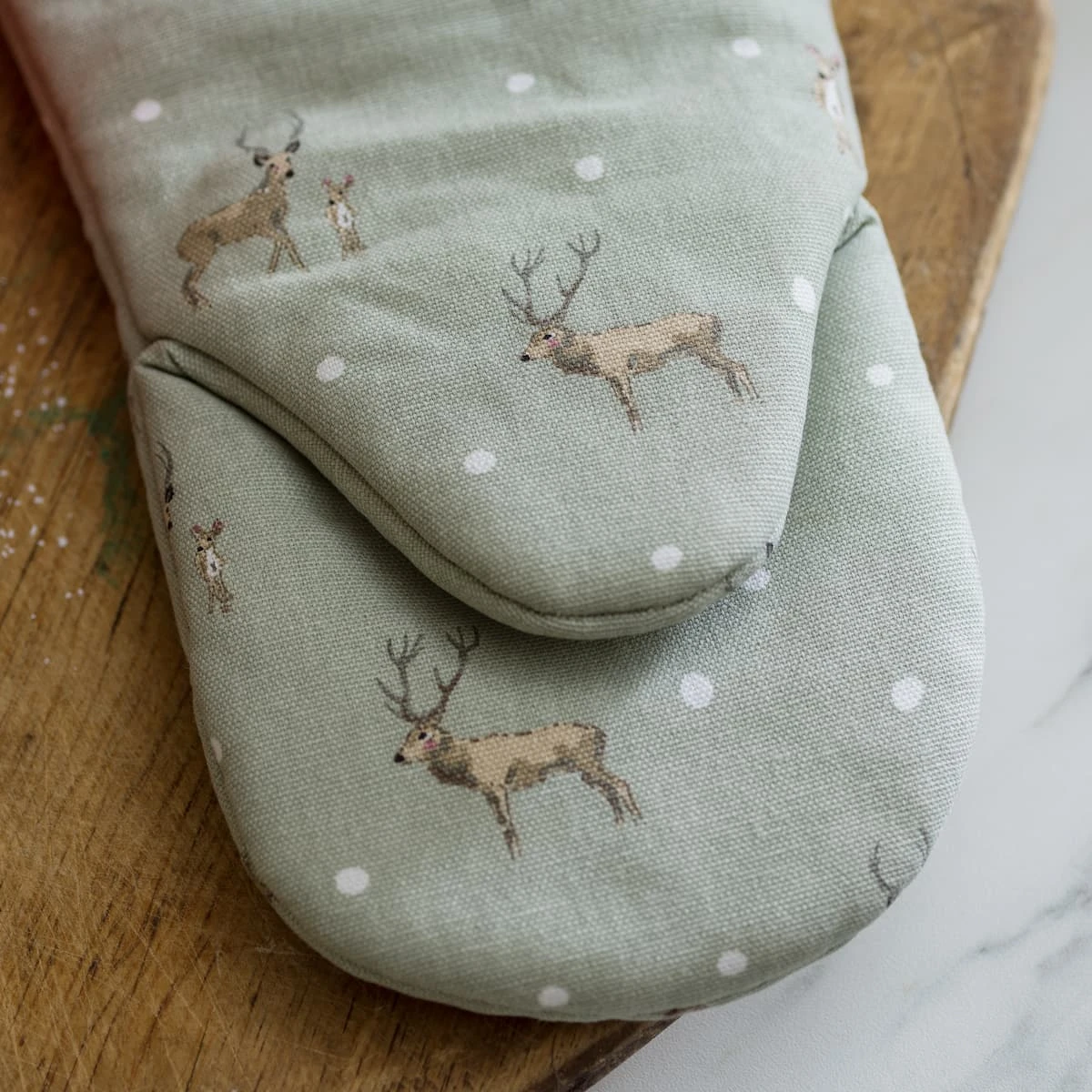 A handy kitchen accessory for manoeuvring hot baking trays around the kitchen. The inner has soft padded terry towelling for extra protection and the mitt has a handy loop so it can be hung next to your cooker or around the kitchen. A charming design featuring magnificent stags and adorable fawns in the snow on a warm grey ground with green undertones, to update your kitchen for the festive season.