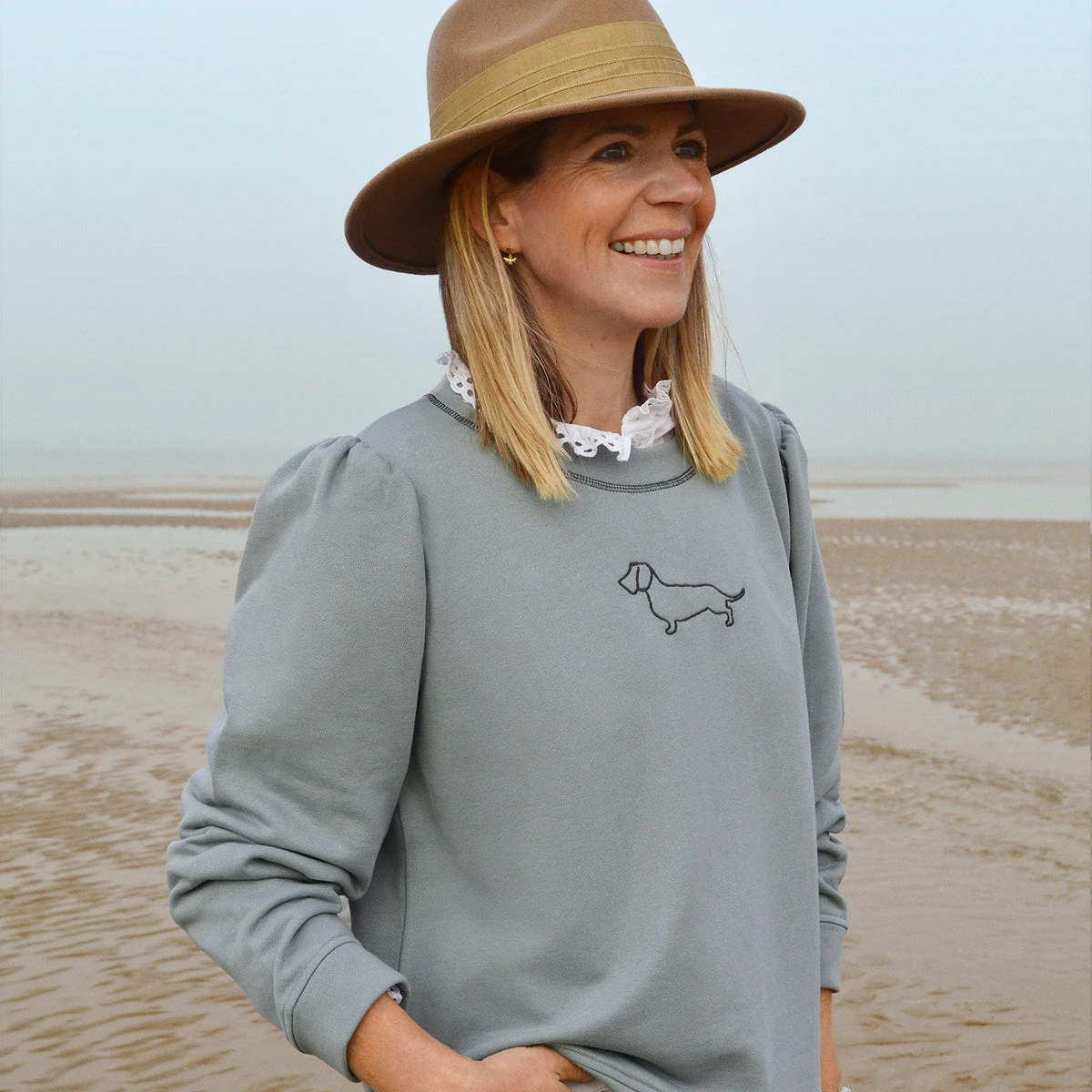 Sweater weather has never sounded better with this beautiful and comfy grey oversized sweatshirt which features Sophie’s adorable dachshund illustration embroidered on the front. Perfect for cosying up in the colder months.