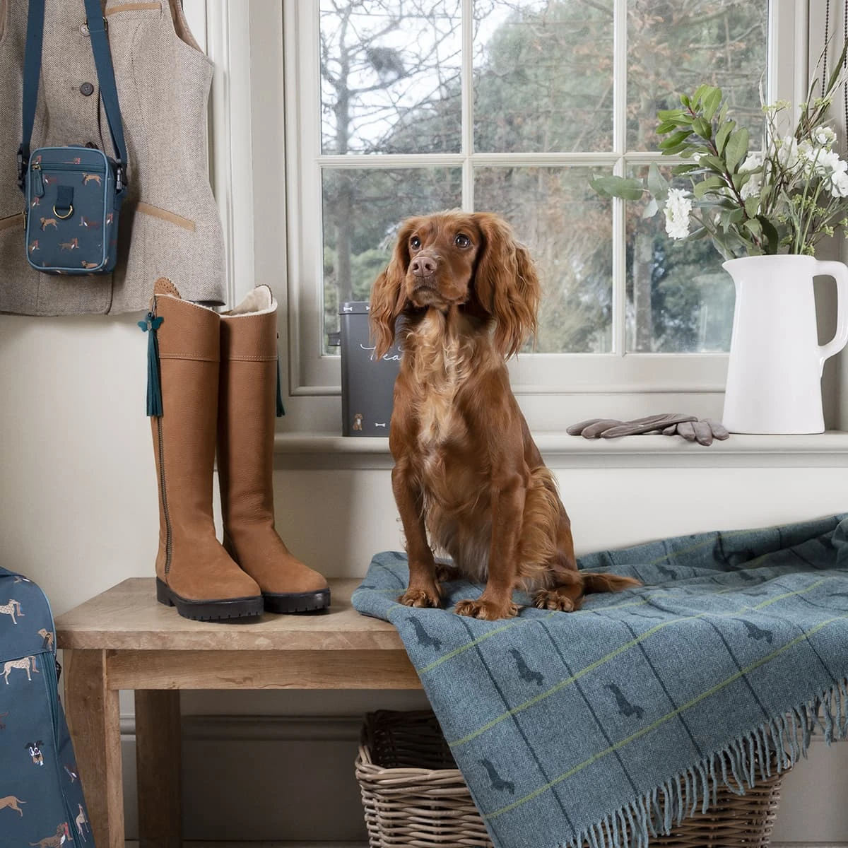 This beautiful knitted throw is made from 100% wool and is sure to add texture and comfort to any home interior. Featuring lovely dachshund silhouettes on a navy checked ground. Perfect for layering over sofas, armchairs, or displaying as a bed throw.