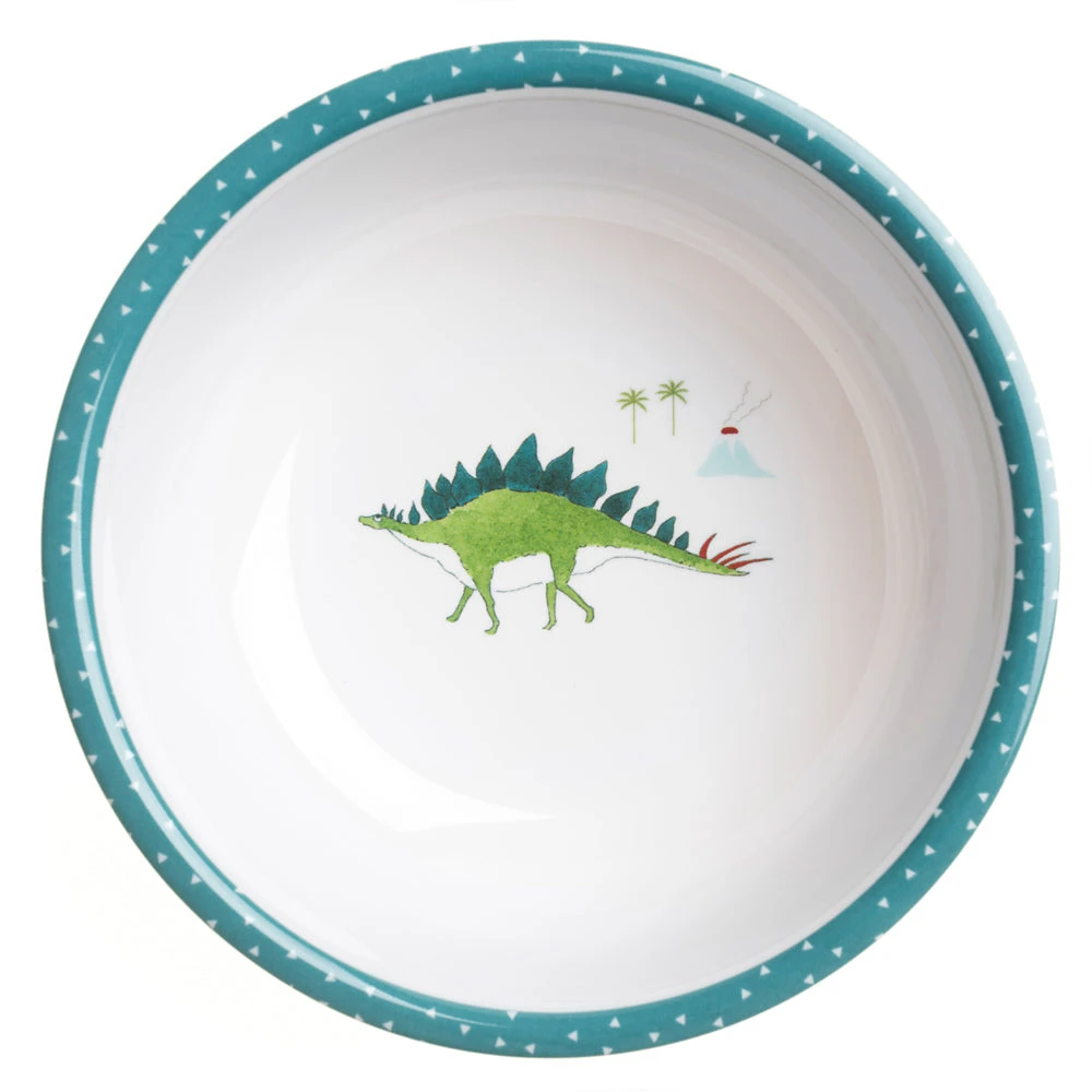 Make meal times fun, with this Dinosaurs melamine bowl. Sophie’s illustrations of a Stegosaurus, volcano, and palm trees sit in the middle of the bowl and an eye-catching blue triangle pattern surrounds the edge.