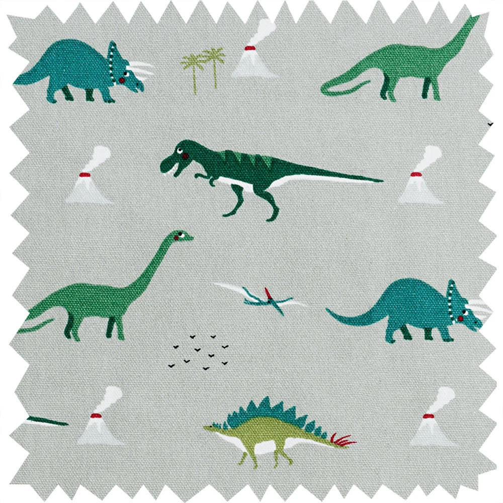 Our Dinosaurs fabric is 100% cotton and can be bought by the metre. The sage blue Dinosaur design features the Diplodocus, Stegosaurus, Triceratops, flying Pterodactyls and the famous T-Rex!