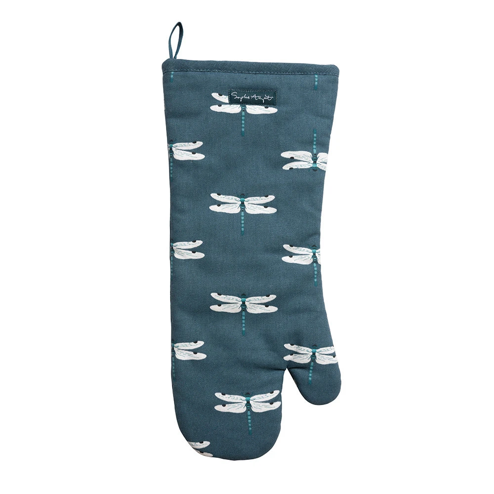 Beautiful dragonflies whizz around this midnight blue oven gauntlet – a spring and summer design for your kitchen.