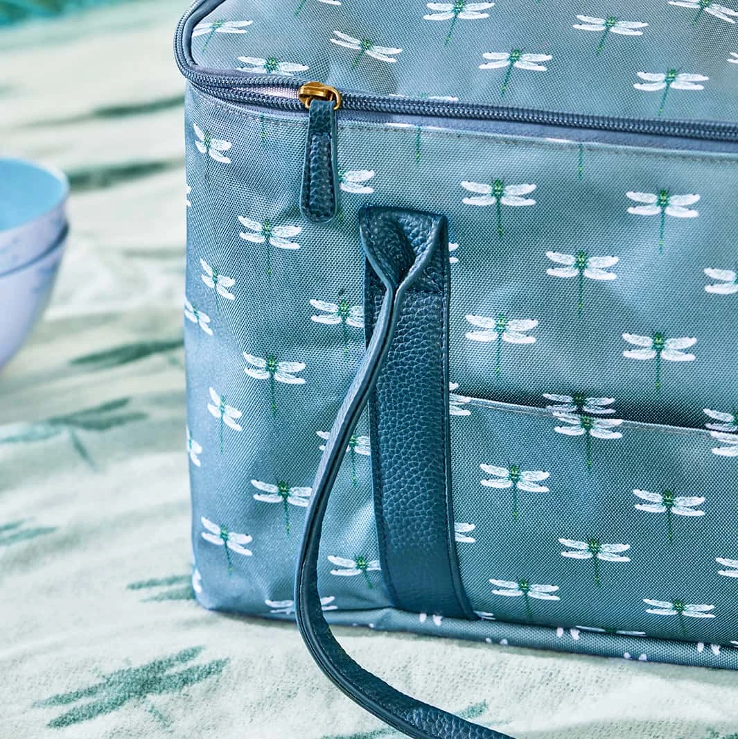 Pack up the perfect picnic with this practical and stylish pocket picnic bag from our Dragonfly Collection. Featuring Sophie’s delicate dragonfly illustrations hovering on a grey blue ground, it is the perfect summer essential for a picnic in the park, family days out, beach trips, camping or a romantic picnic for two!