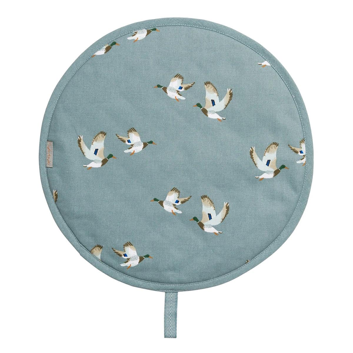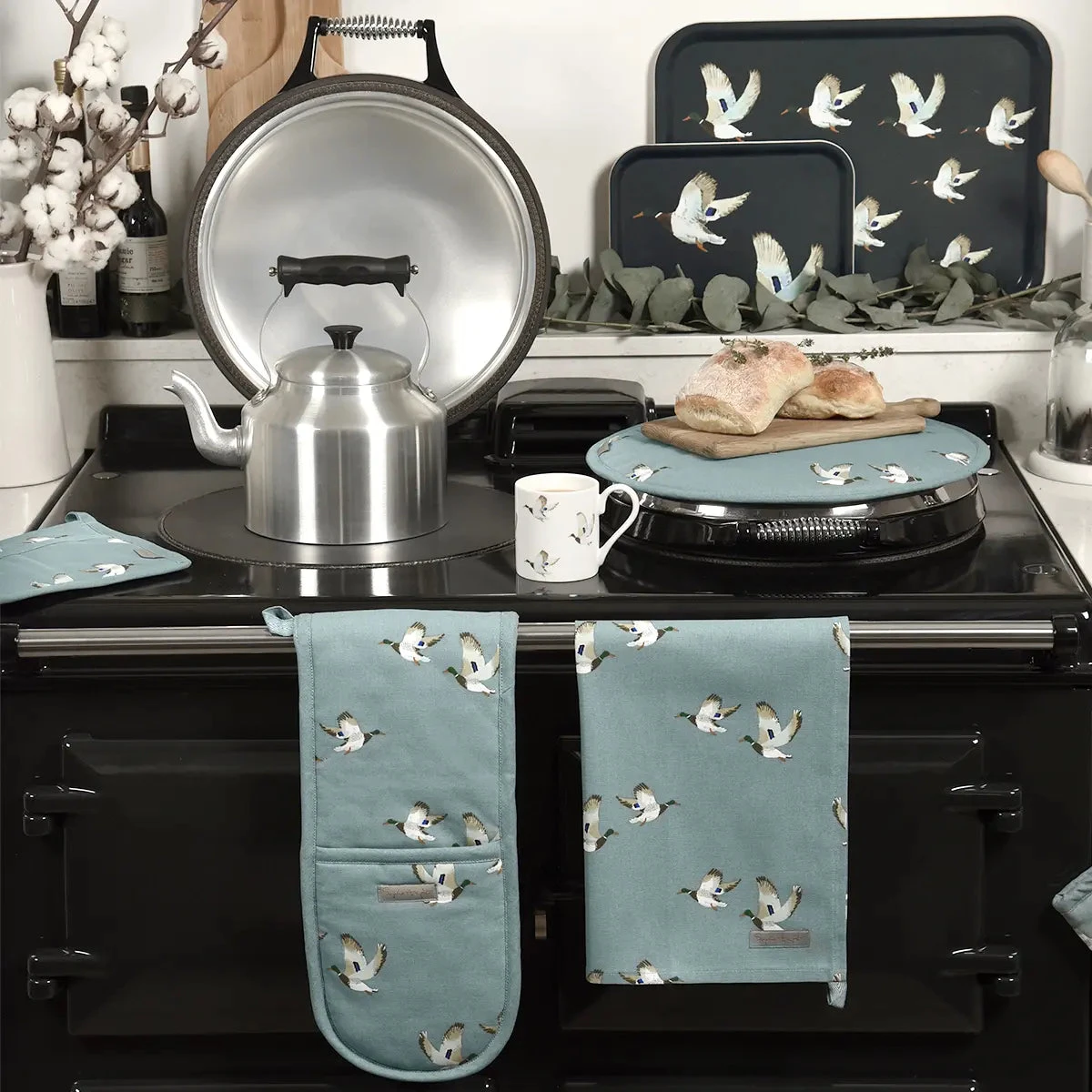 A beautiful hob cover covered in ducks on a stonewashed blue background, this oven pad is perfect for adding a touch of colour to your kitchen. Excellent for keeping your cooking stove clean and free from scratches, as well as keeping in the heat. A wonderful gift for someone with a stove and works wonderfully in any country kitchen. We don’t recommend placing piping hot pans directly onto the cover – they are not ‘heatstands.’