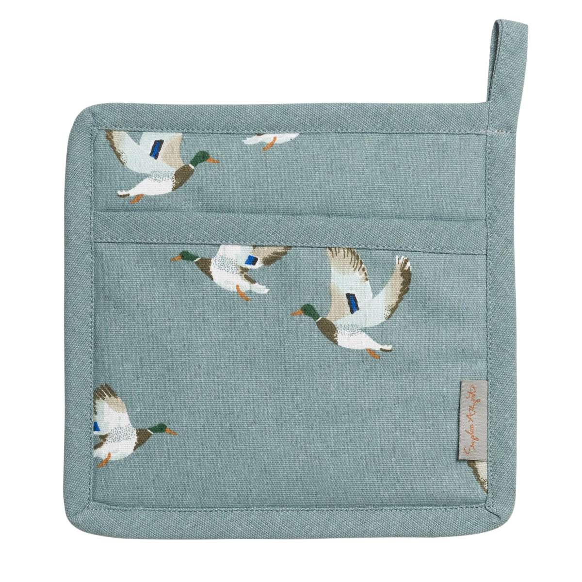A kitchen essential, this practical pot grab features elegant flying ducks on a stonewashed blue background. This lovely pot grab is made from 100% cotton and has internal padding for excellent insulation.