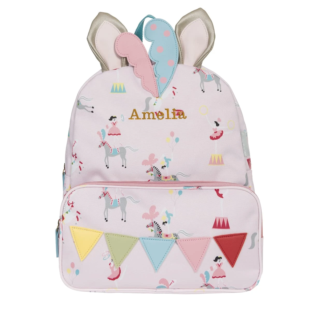 A fun and playful kids backpack covered in fairground ponies and circus acrobats on a sweet pink background. With feature bunting and cute pony ears, this lovely backpack is the perfect school bag and made from practical wipe-clean polyester. Pairs excellently with the Fairground Ponies Lunchbag.