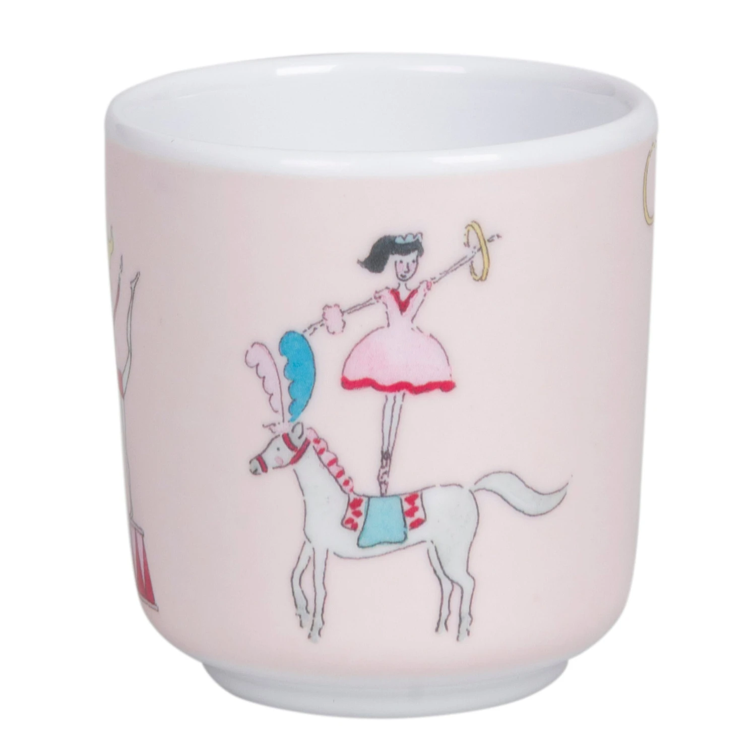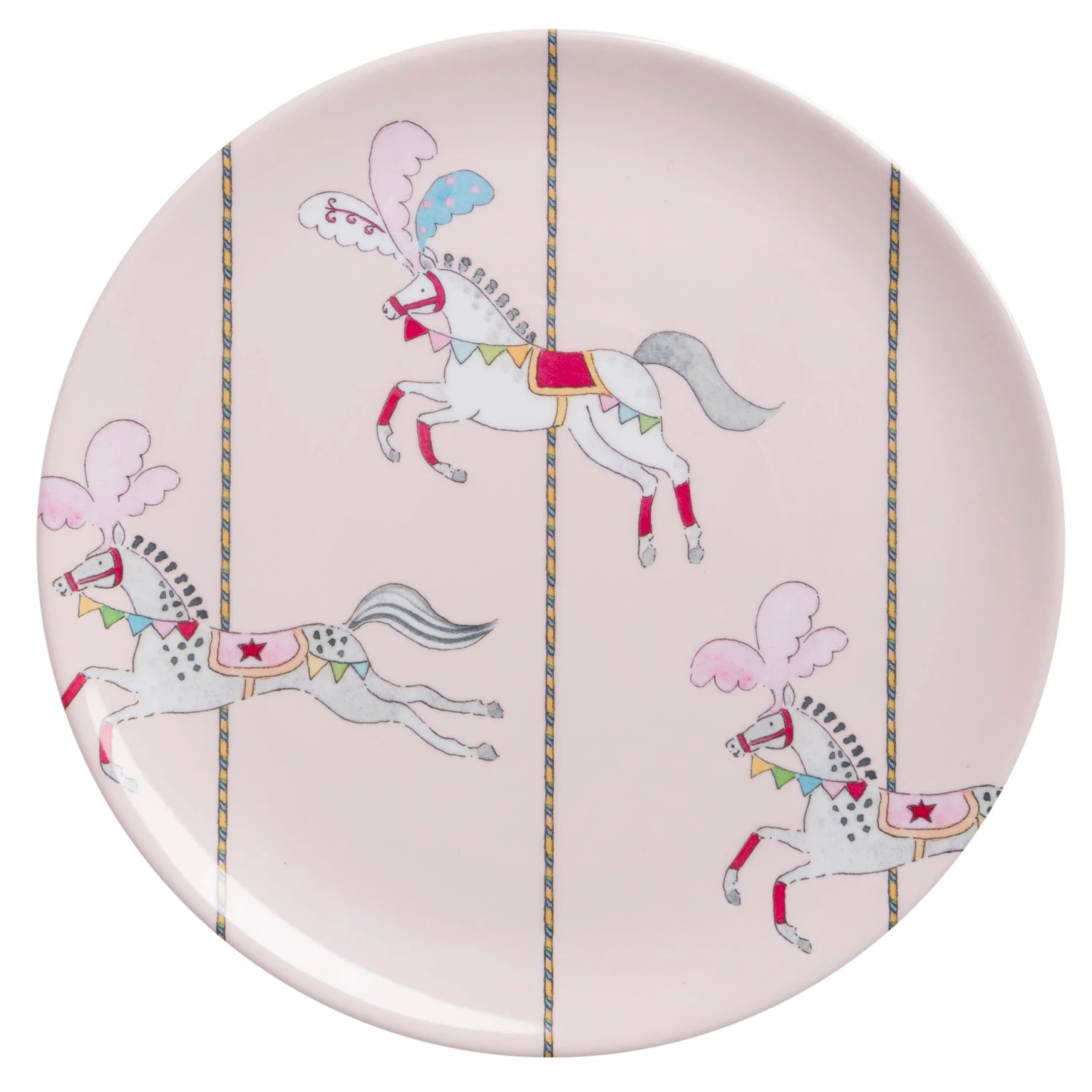 This Fairground Ponies themed seven-piece dining set includes a plate, bowl, cup, knife, fork, spoon and egg cup. A lovely little gift set for children’s birthdays and christenings. This cute set features fairground ponies and acrobats on a sweet pink background.