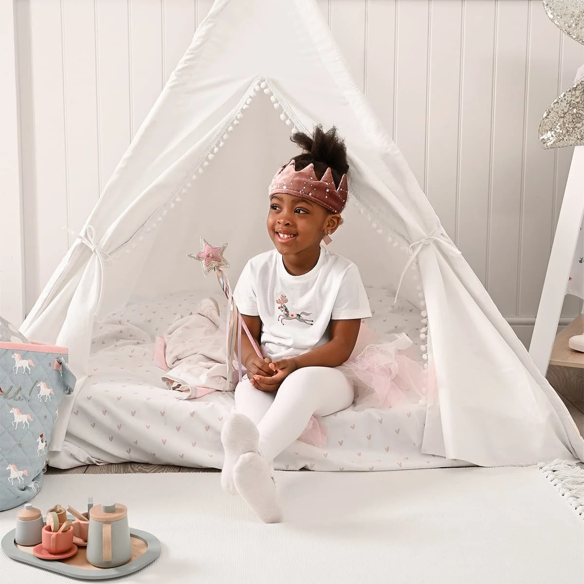 Made from 100% organic cotton, this adorable kids t-shirt has a unique fairground ponies design, made up of different embroidered techniques for a fun and playful look and is finished with magical sequins. This off-white children’s t-shirt is perfect for spring and summer and excellent for kids who love fairground ponies! A lovely gift idea for little ones.