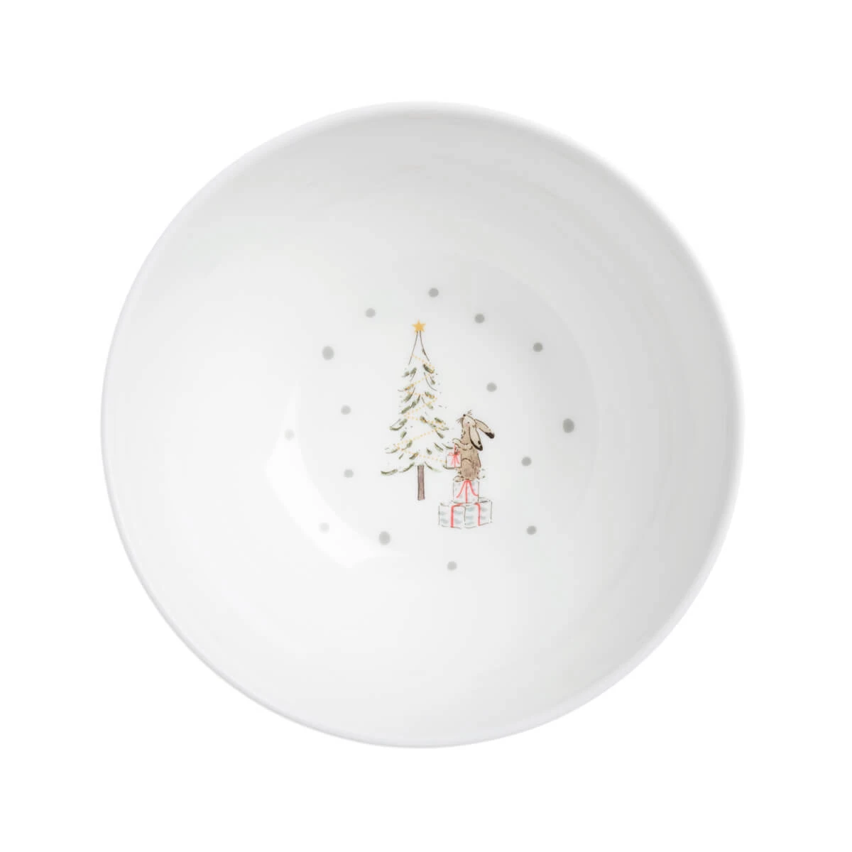 An elegant white fine bone china bowl perfect for your Christmas nibbles. The centre features a beautiful scene of a hare looking up at a Christmas tree in a snowy setting. This lovely bowl is perfect for nibbles, snacks, festive dinner parties or sat in front of the tv enjoying a bowl of popcorn whilst watching your favourite Christmas films.
