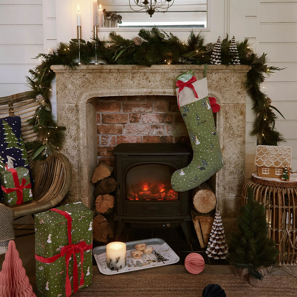 Our stylish handmade printed tray is sure to add a magical festive feel to any home. This large tray features a festive forest scene with a badger, hare, hedgehogs, robins, a squirrel and an owl gathered together watching Father Christmas flying through the night sky. This printed tray is made with Birchwood sourced from an FSC certified supplier and are perfect for serving food and drinks or using for décor.