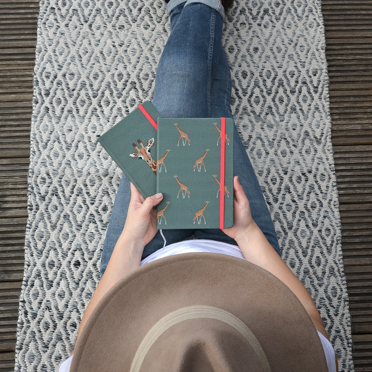 This lovely A5 Notebook is covered in fabulous giraffes on a teal green background. It has 160 pages (80 sheets) of crisp ruled ivory paper, a practical ribbon page marker and a coral pink elastic closure. A great little notebook for your handbag or for list-making at home. A wonderful gift idea for those who love to write.