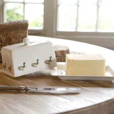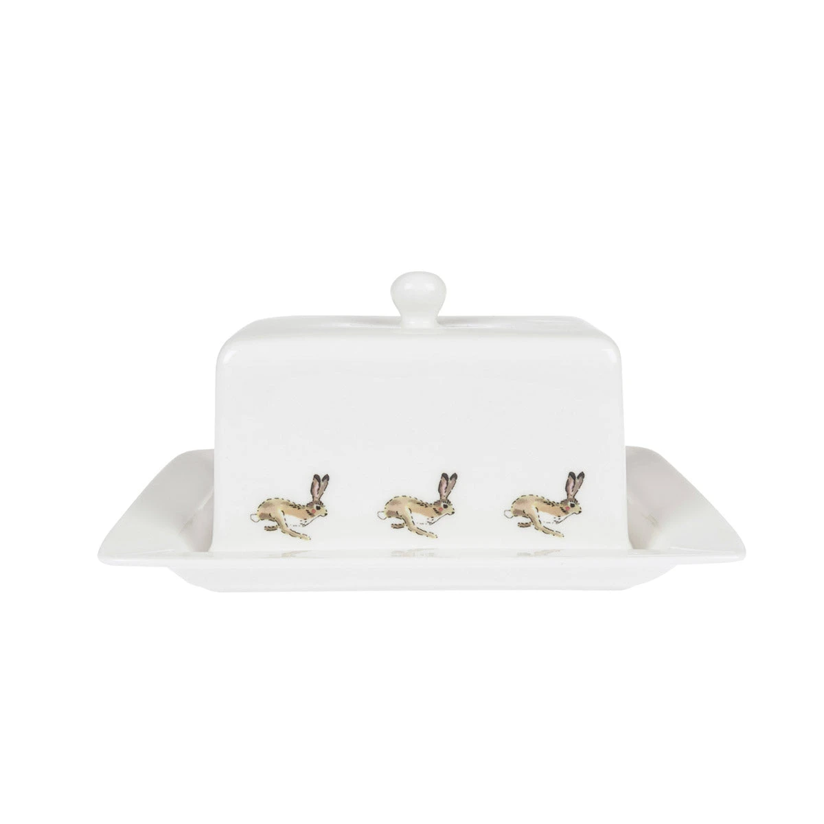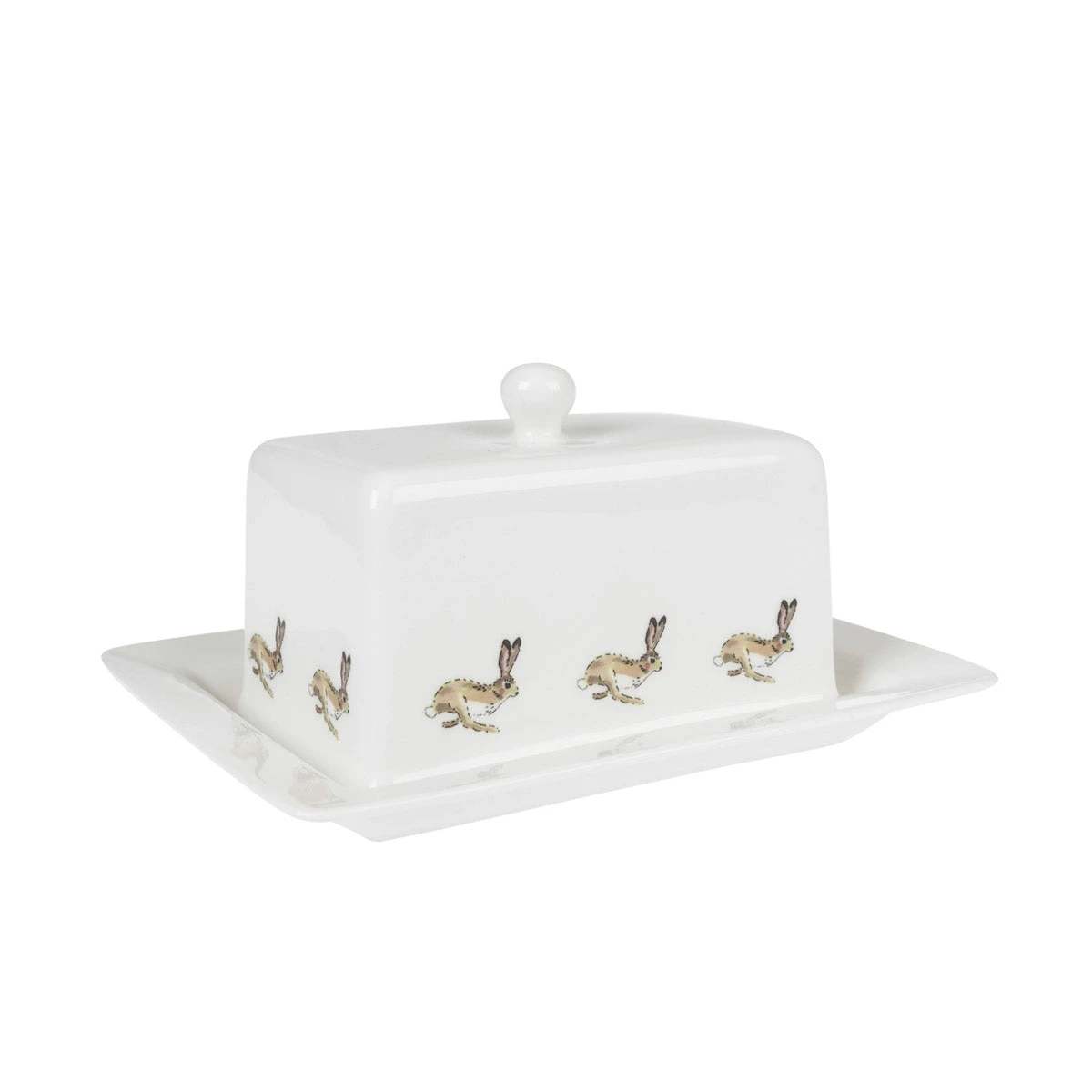 Keep your butter fresh and at a perfect temperature for spreading with this unique butter dish from the Hare collection. Made from fine bone china, it will hold a regular 250g pack of butter. Hares race around the base of the white china lid.