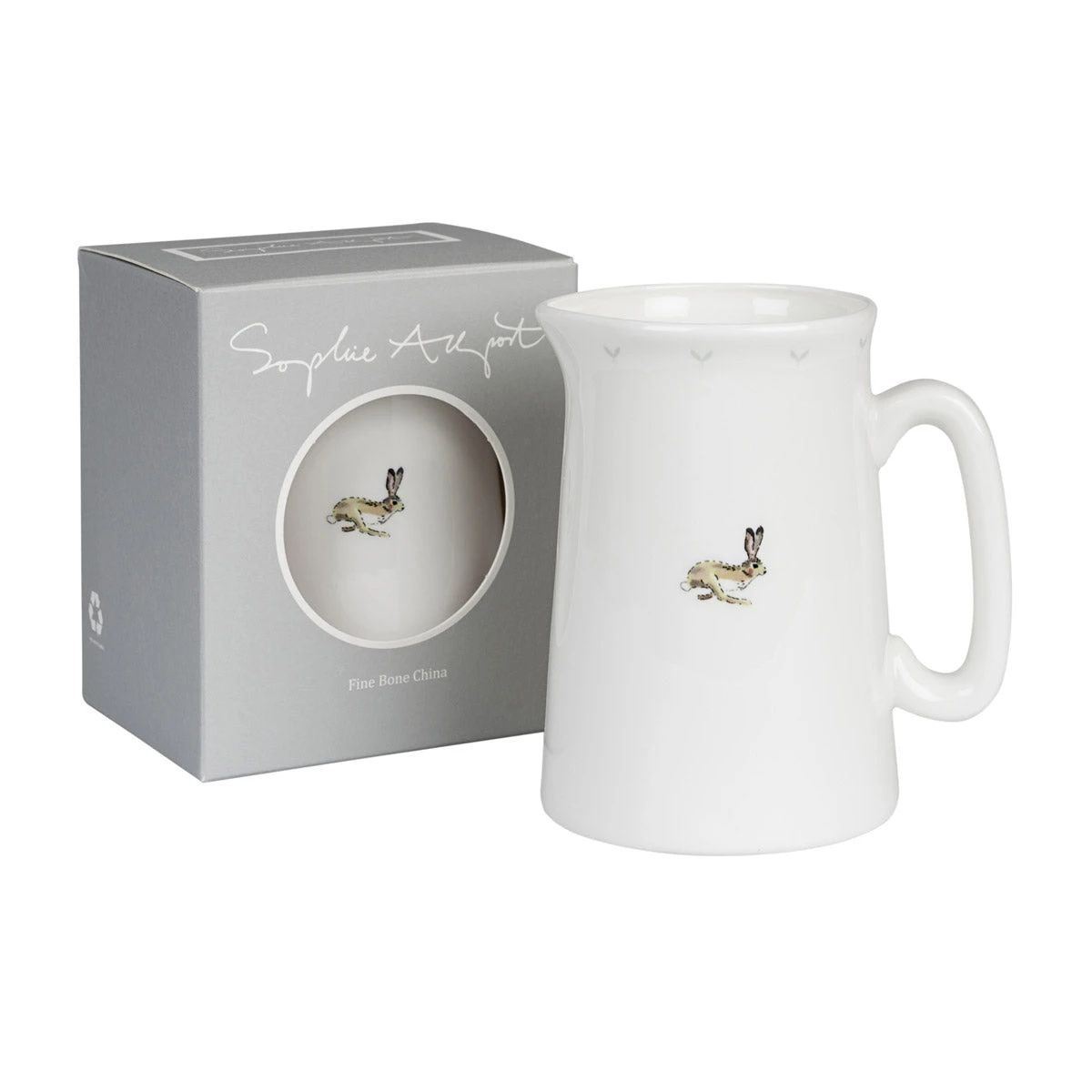 A racing hare features on the front and back of this fine bone china jug, with some small green seedlings around the rim. A small seedling is featured on the inside rim at the handle. It is available in four sizes – mini, small, medium, and large. You’ll find the perfect size for milk, cream, gravy, custard, water and chocolate sauce. The large 1.1-litre jug makes a lovely flower vase too! All our jugs come in a smart gift box (which also makes them easy to wrap.) A wonderful present for any gardening enthusiast, and also makes a lovely Easter gift.