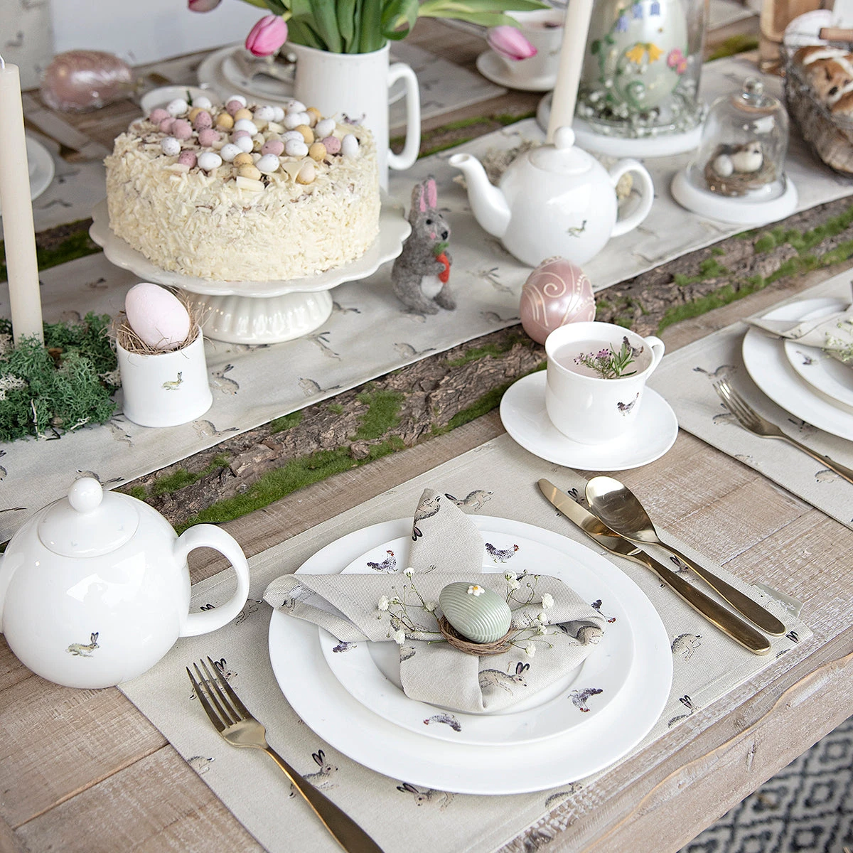 These lovely cotton napkins come in a set of four and are covered in Hares racing over a stone coloured background. A lovely addition to any country kitchen, the Napkins are 41cm x 41cm and made from durable cotton. Bound to brighten up everyday kitchen dining or smarten up a dinner party table setting.Why not consider some matching Hare Placemats or Table Runner to really impress your dinner guests with a beautiful co-ordinated look – indoors or outdoors.