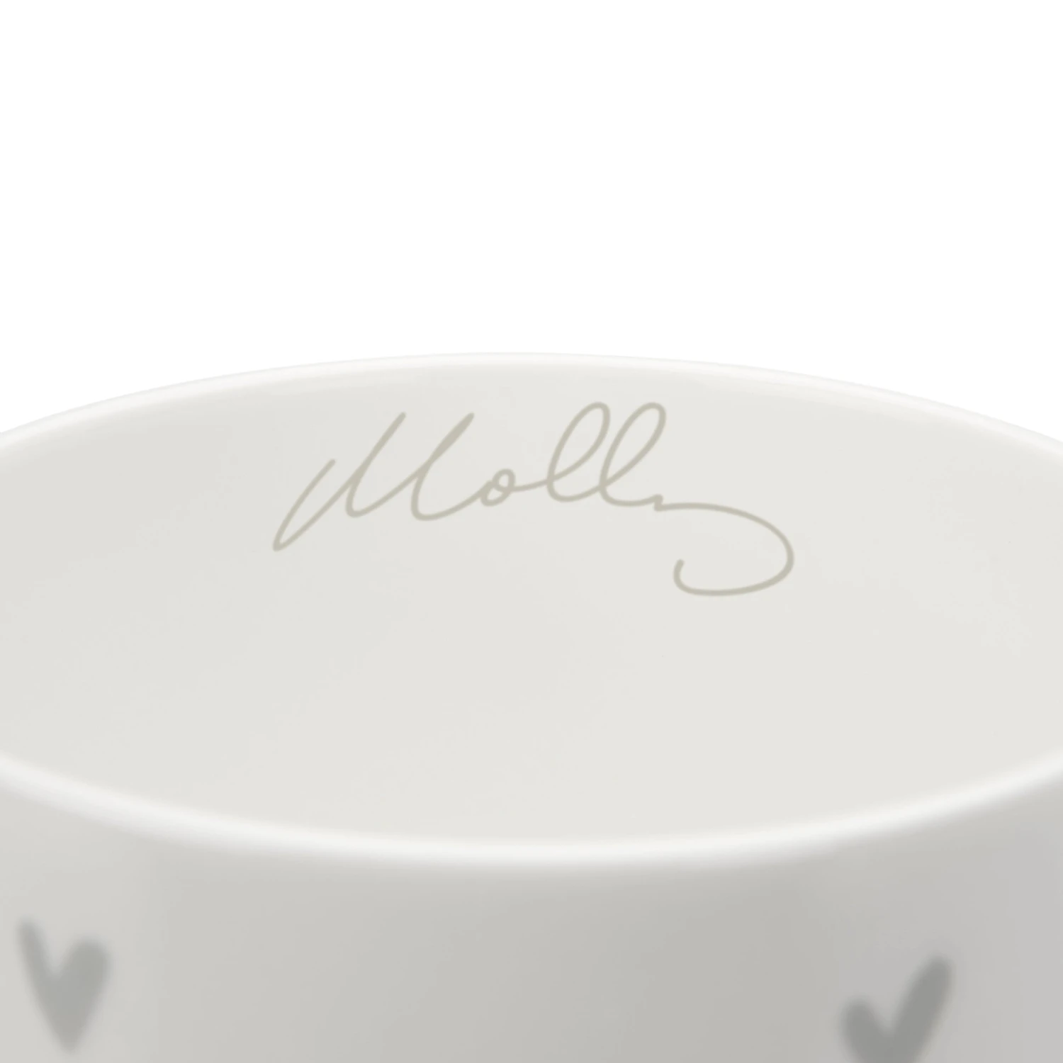 This white fine bone china mug, covered in small grey hearts, makes the perfect gift. Hand decorated and finished in the UK, it will brighten up every cup of tea or coffee.