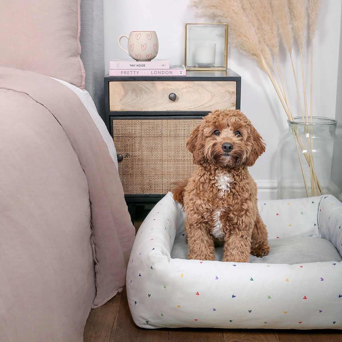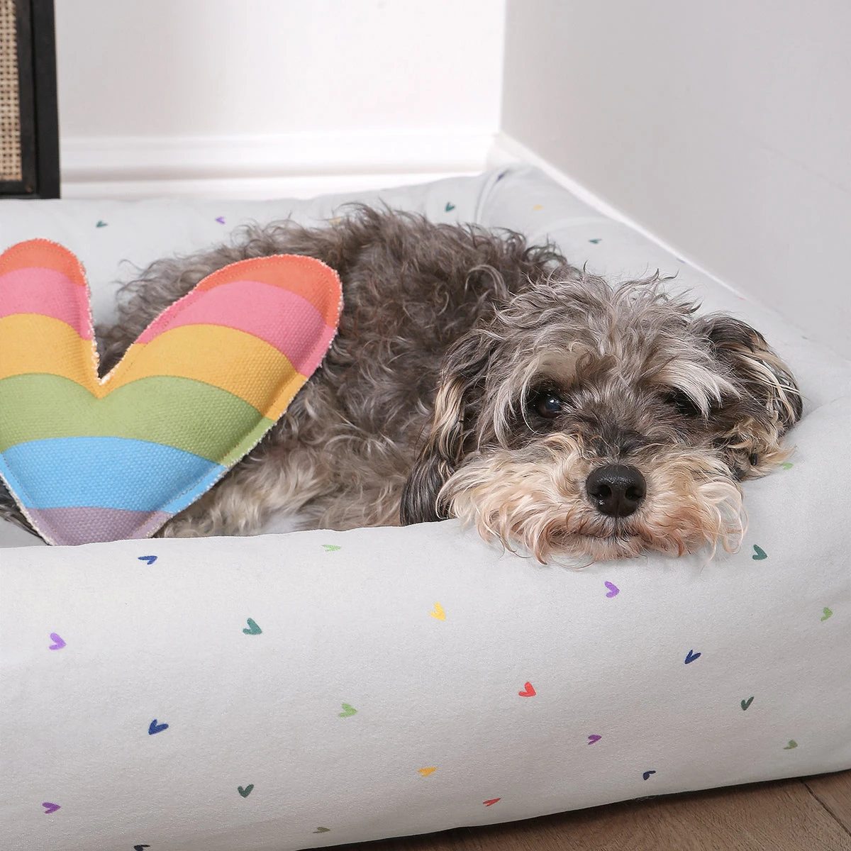 A wonderful place for your beloved pet to curl up after a long day! This cosy pet bed features colourful hearts on a neutral grey background with a super soft velvet cover and padded sides for extra comfort. An excellent bed for your dog or cat.
