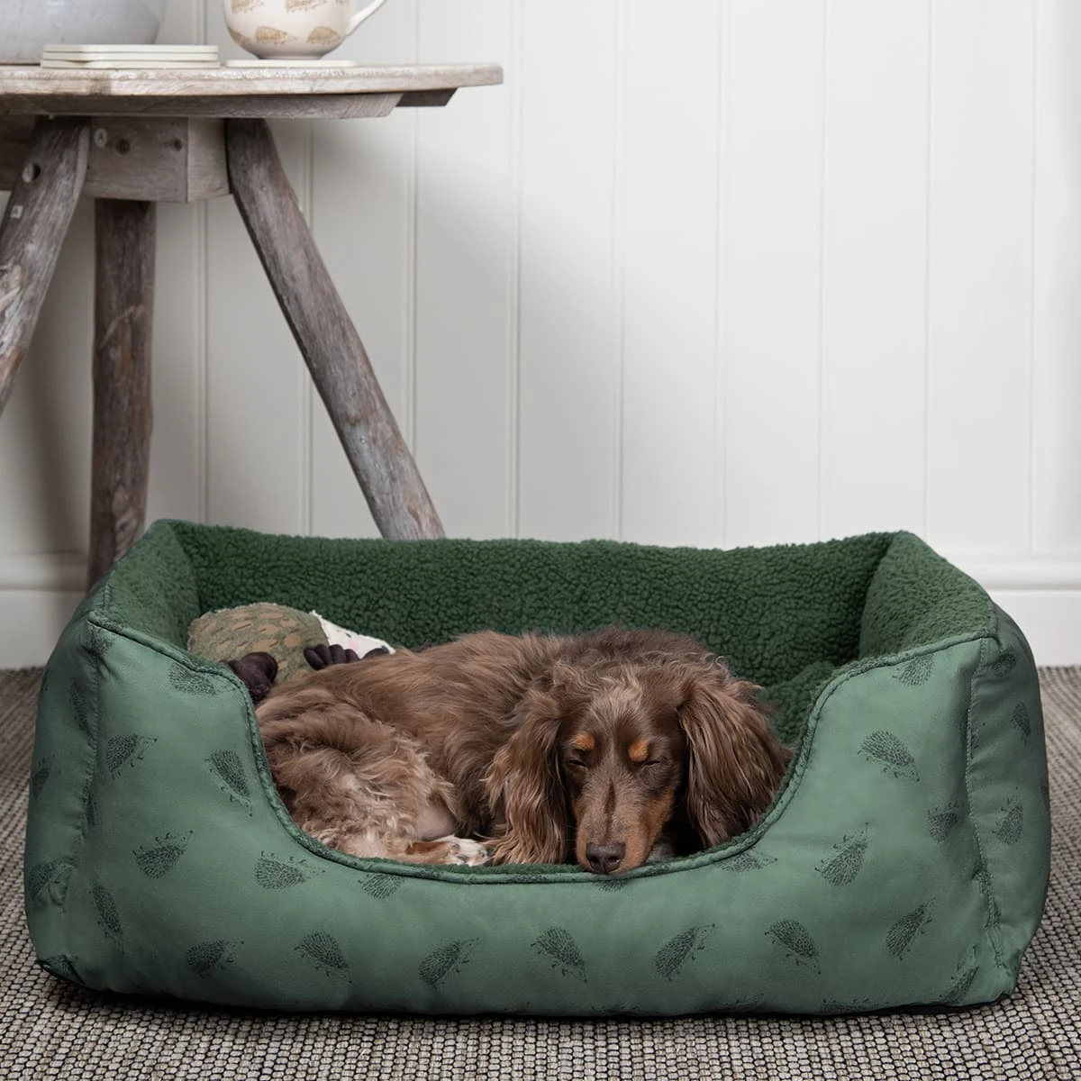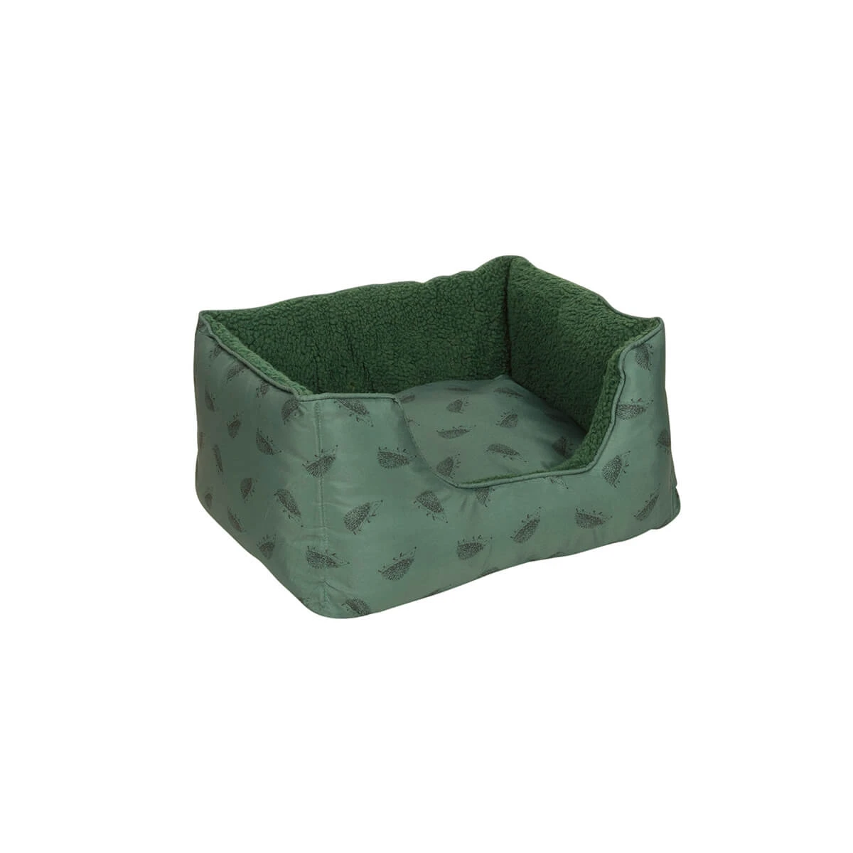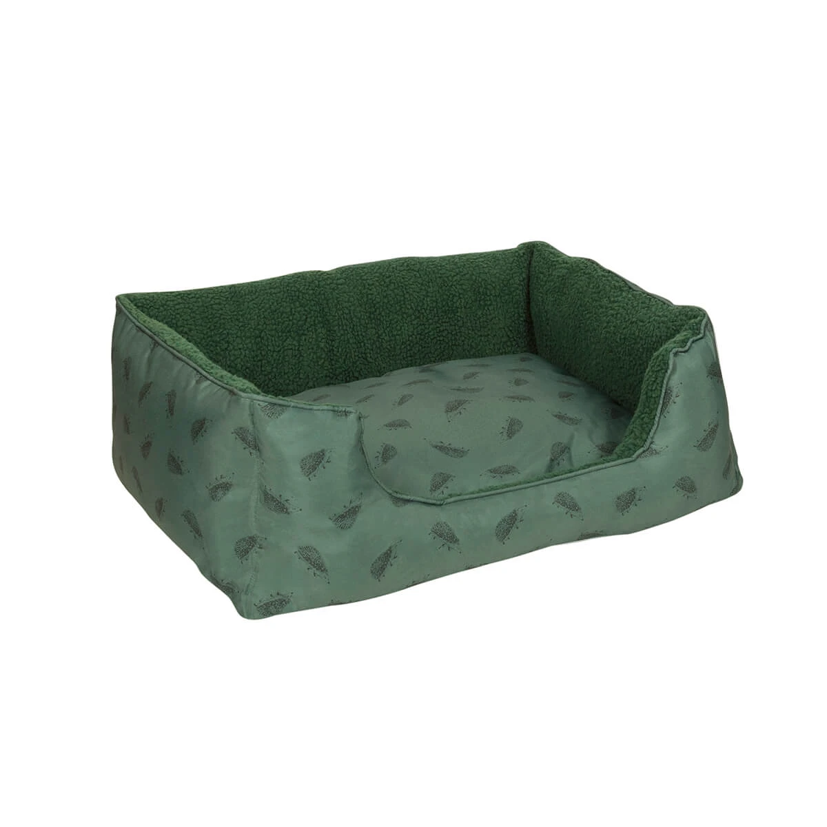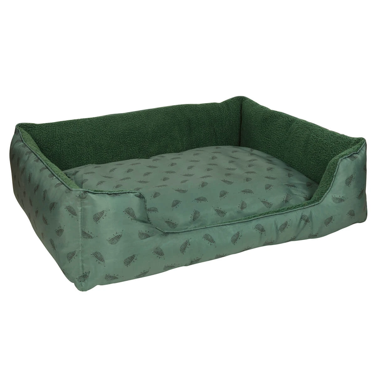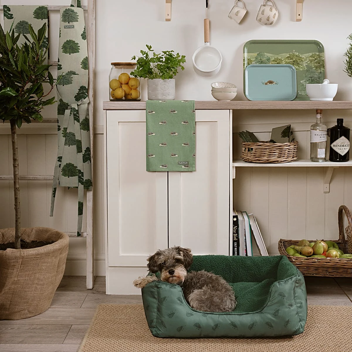 Add an autumnal country touch to your home with this beautiful pet bed covered in Sophie’s charming hedgehog illustrations on a hunter green ground.