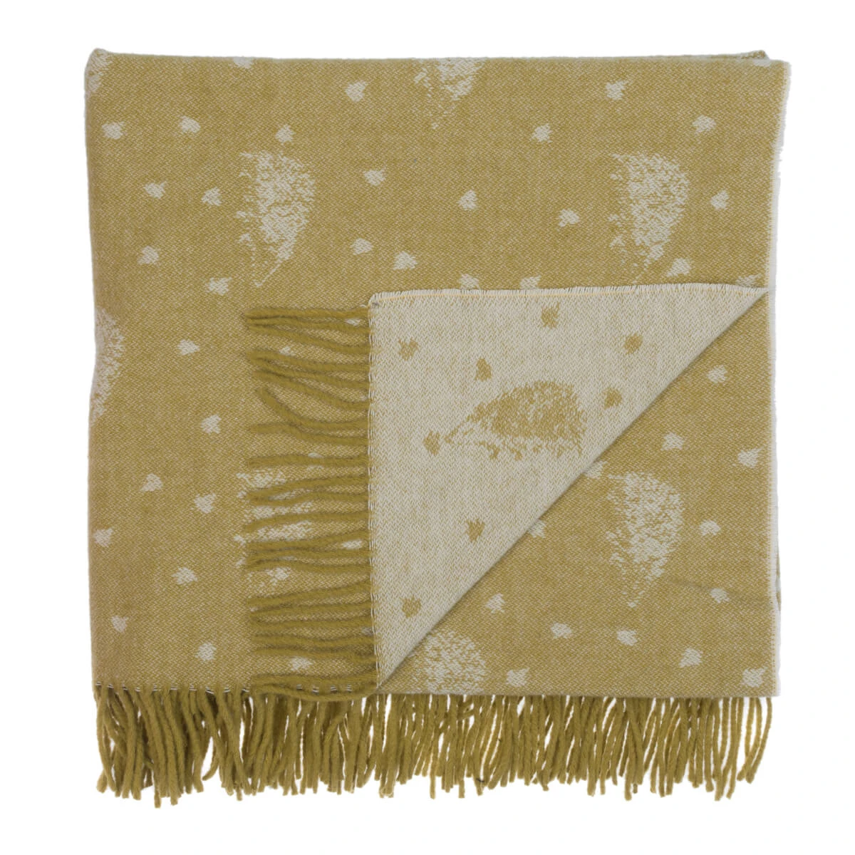 Made from 100% wool, this beautiful knitted throw will add a charming country touch to any home. Covered in adorable hedgehogs and falling autumn leaves on a mustard yellow ground. Perfect for layering over sofas, armchairs, or displaying as a bed throw.