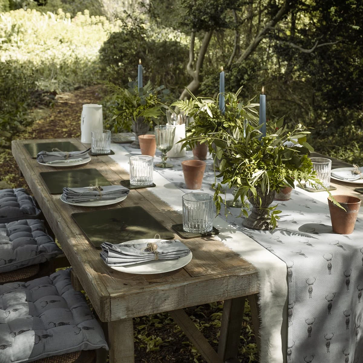 These lovely chair pads in our Highland Stag design are 100% cotton and will smarten up any seat and make it extra comfy. They can be used as kitchen chair pads, dining booster cushions and garden seat cushions. The design features magnificent stags on a slate teal coloured background. Perfect for country chairs in the garden, sun room, bedroom, kitchen or dining room.