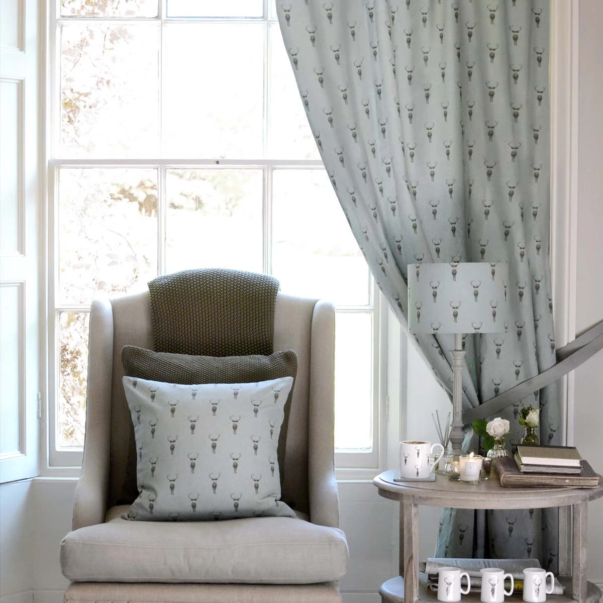 This gorgeous Highland Stag fabric is 100% cotton and can be bought ‘by the metre.’ The design features magnificent stags on a slate teal coloured background colour. Perfect for making your own tablecloths, curtains, cushions, and blinds.