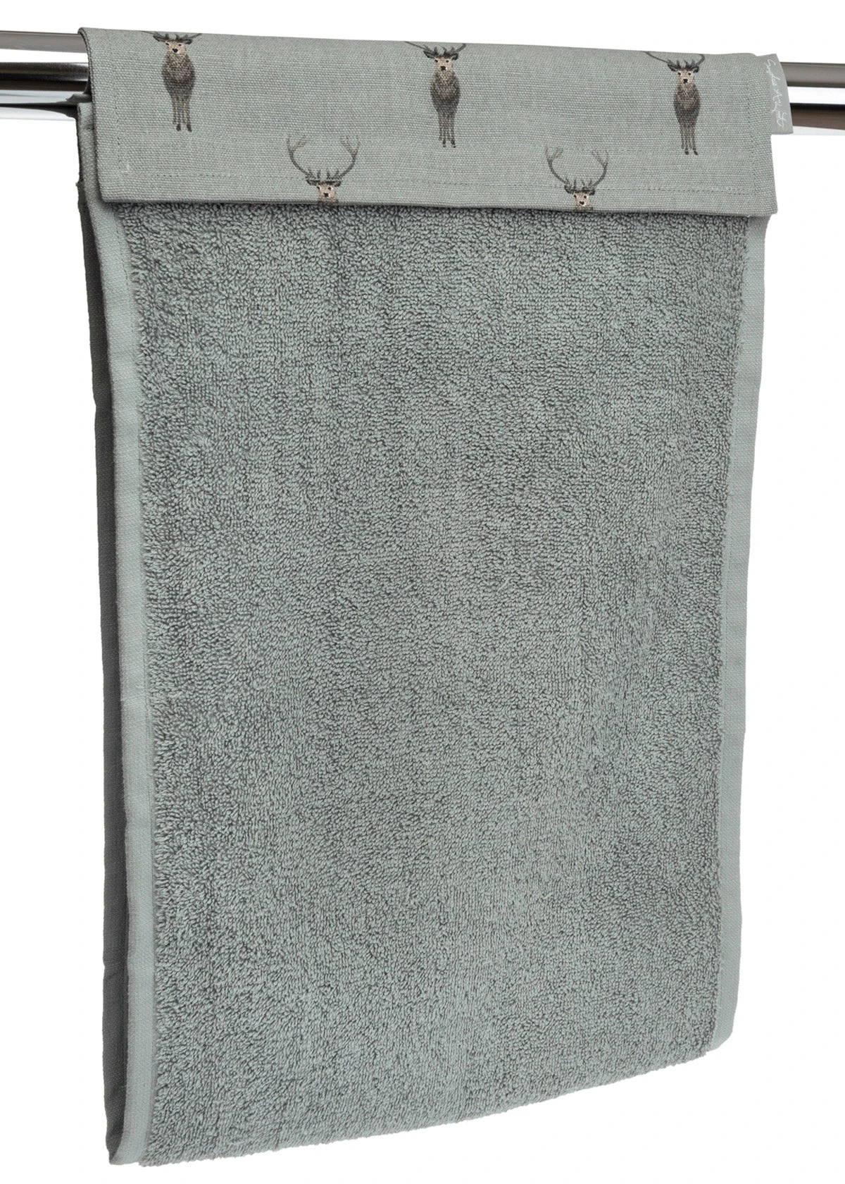 This practical hand towel can hang on your cooker rail. A lovely country design featuring some magnificent stags on a slate teal coloured background. Hard wearing and absorbent, it is velcro fastened to avoid continually falling on the floor! Use in the kitchen on the cooker rail, a towel rail in the utility room or even the downstairs loo.