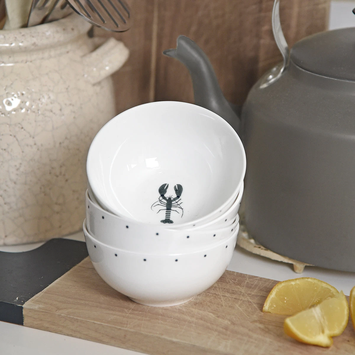 An elegant white fine bone china bowl which features a modern lobster in the centre and dots around the rim. This lovely bowl is perfect for nibbles, snacks, dinner parties or sat in front of the tv enjoying a bowl of popcorn.