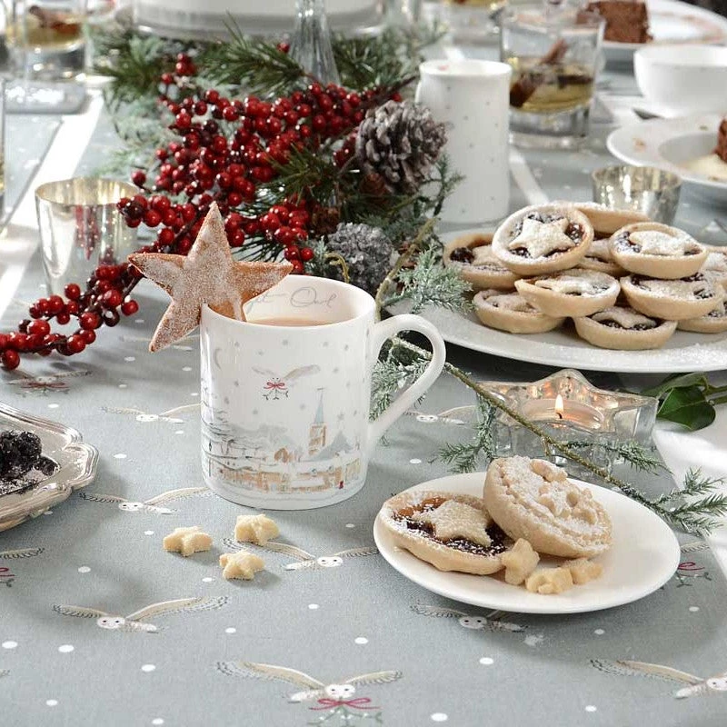 This white fine bone china mug depicts a festive village scene with some graceful Barn Owls swooping in the night sky carrying some mistletoe in their beaks. A simple and stylish festive design from our Night Owl collection and would make a great Christmas gift.