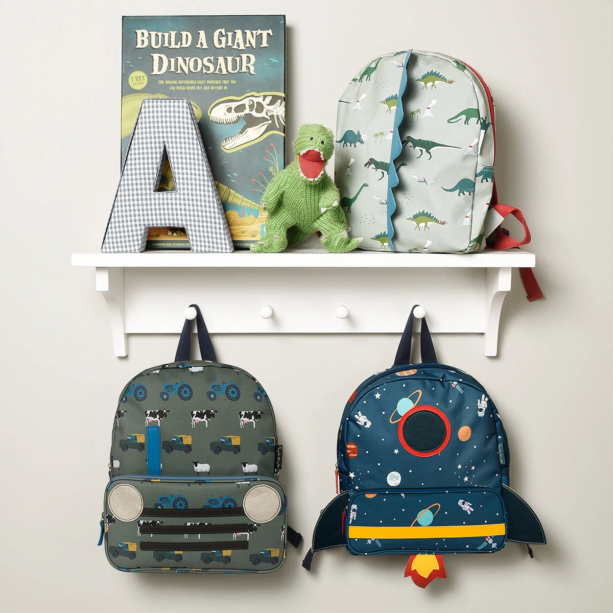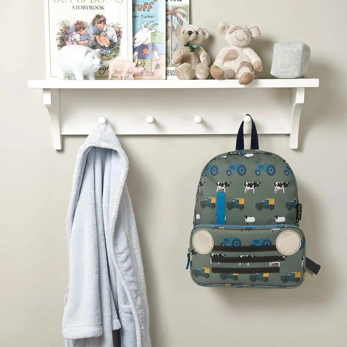 Tractors, Land Rovers, sheep and cows sit against this green On The Farm backpack. Bound to appeal to any farmyard fans, it has an outer pocket and fun tractor detailing.