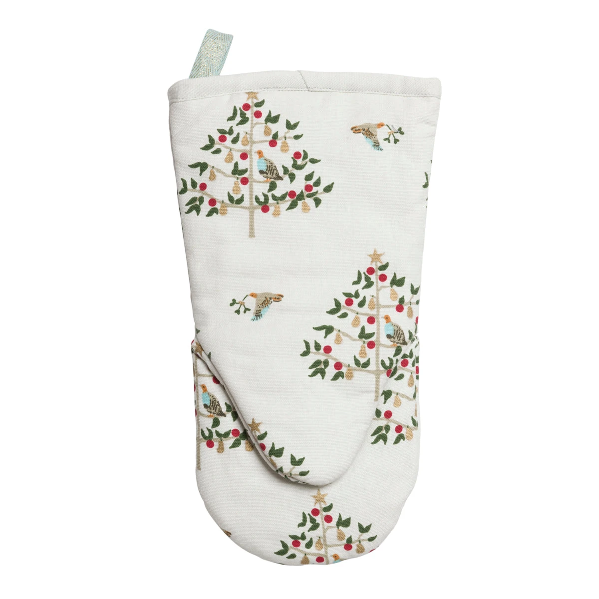 A plump partridge sits gracefully in a pear tree with its beautiful plumage of vivid feathers, while another partridge elegantly passes by on a white stone background. This lovely oven mitt is perfect for adding a touch of Christmas to your kitchen this season and ideal for moving your hot pots and pans around, from your sprouts to your Yorkshire puds.