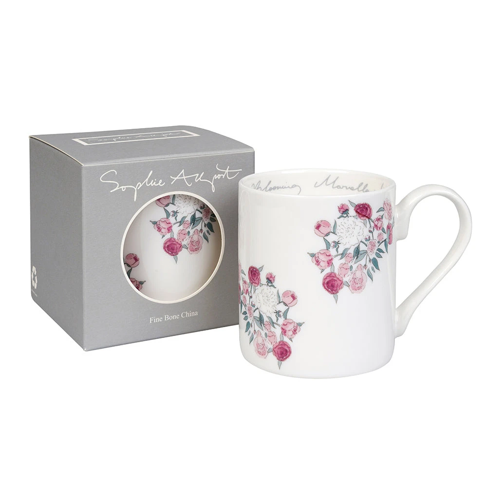 The voluminous blooms of the vibrant peony flower are brought to life on this elegant floral fine bone china mug.