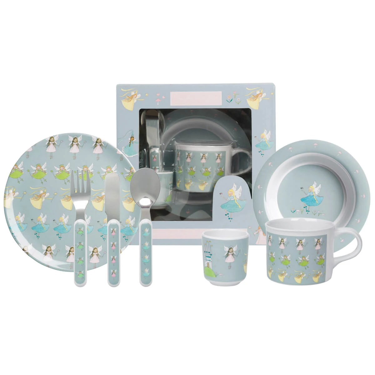This magical Princess Fairies themed seven-piece dining set includes a plate, bowl, cup, knife, fork, spoon and egg cup. It makes a lovely little set for children’s mealtimes or gift idea for birthdays. Featuring lots of enchanting princess fairies on a pale lilac duck egg coloured ground.Â