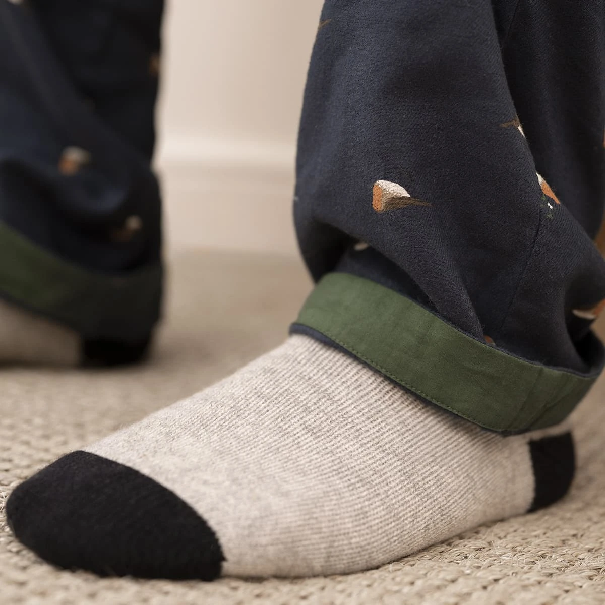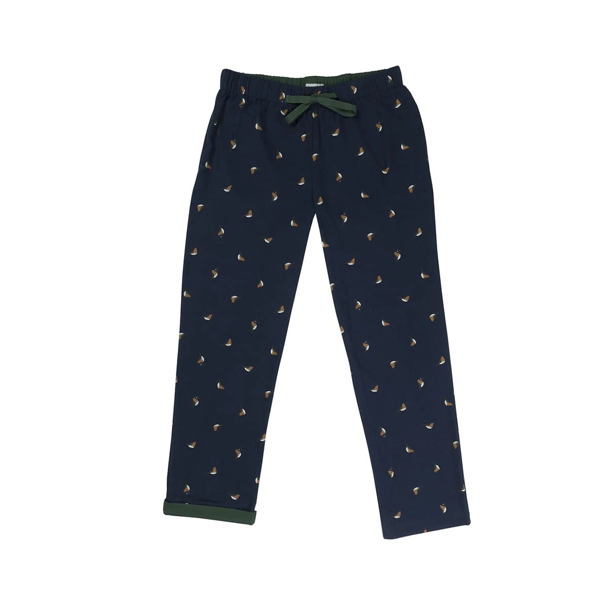 These cosy Robin men’s pyjama bottoms are perfect for the lead up to the big day. The bottoms are 100% cotton and are dotted with plump red-breasted Robins holding sprigs of mistletoe on a dark blue ground. They feature practical pockets, a handy tie waist and can be turned up at the cuff. These pyjama bottoms for men are perfect for bedtime or lounging around in, and would make a cosy gift idea for him this Christmas. Available in five sizes.