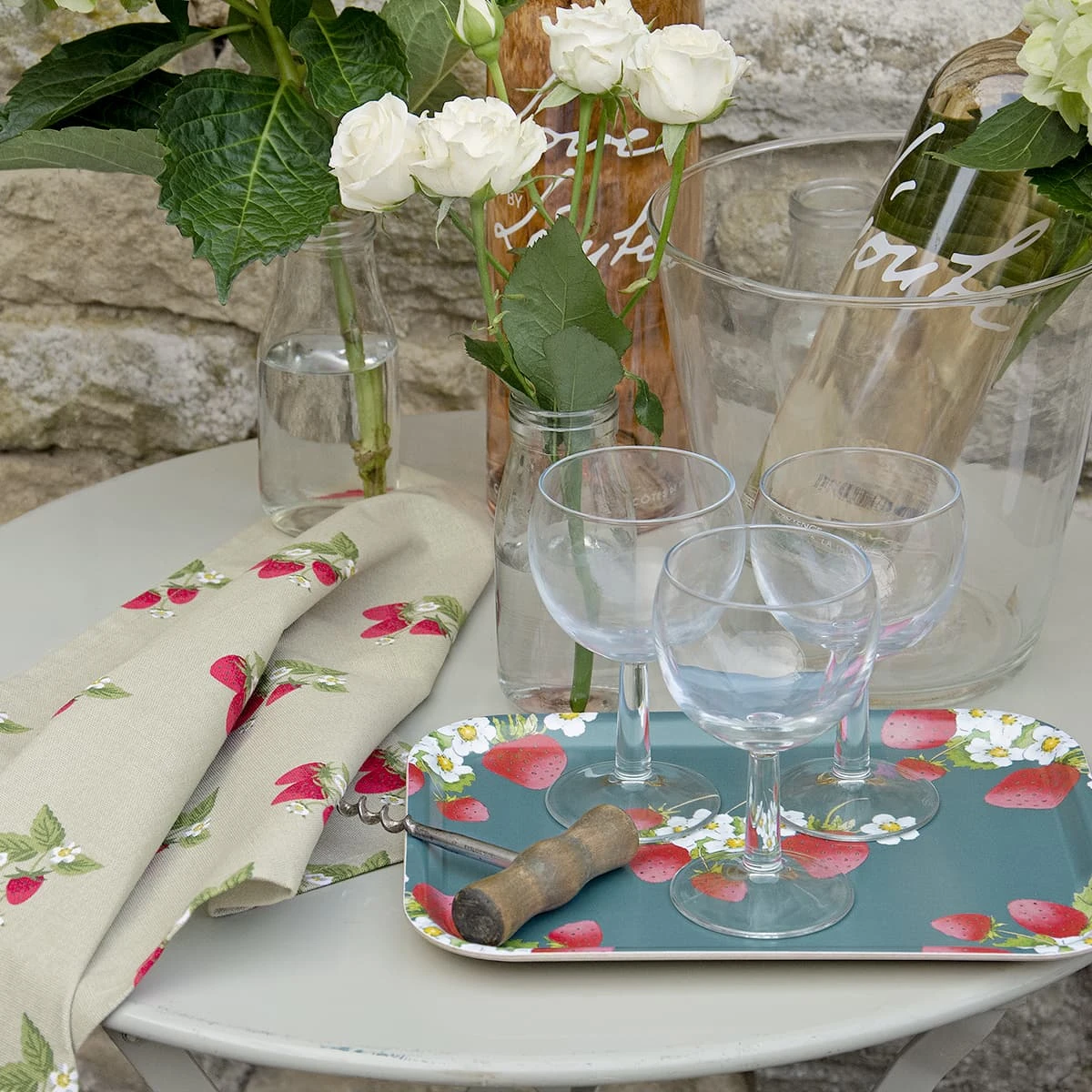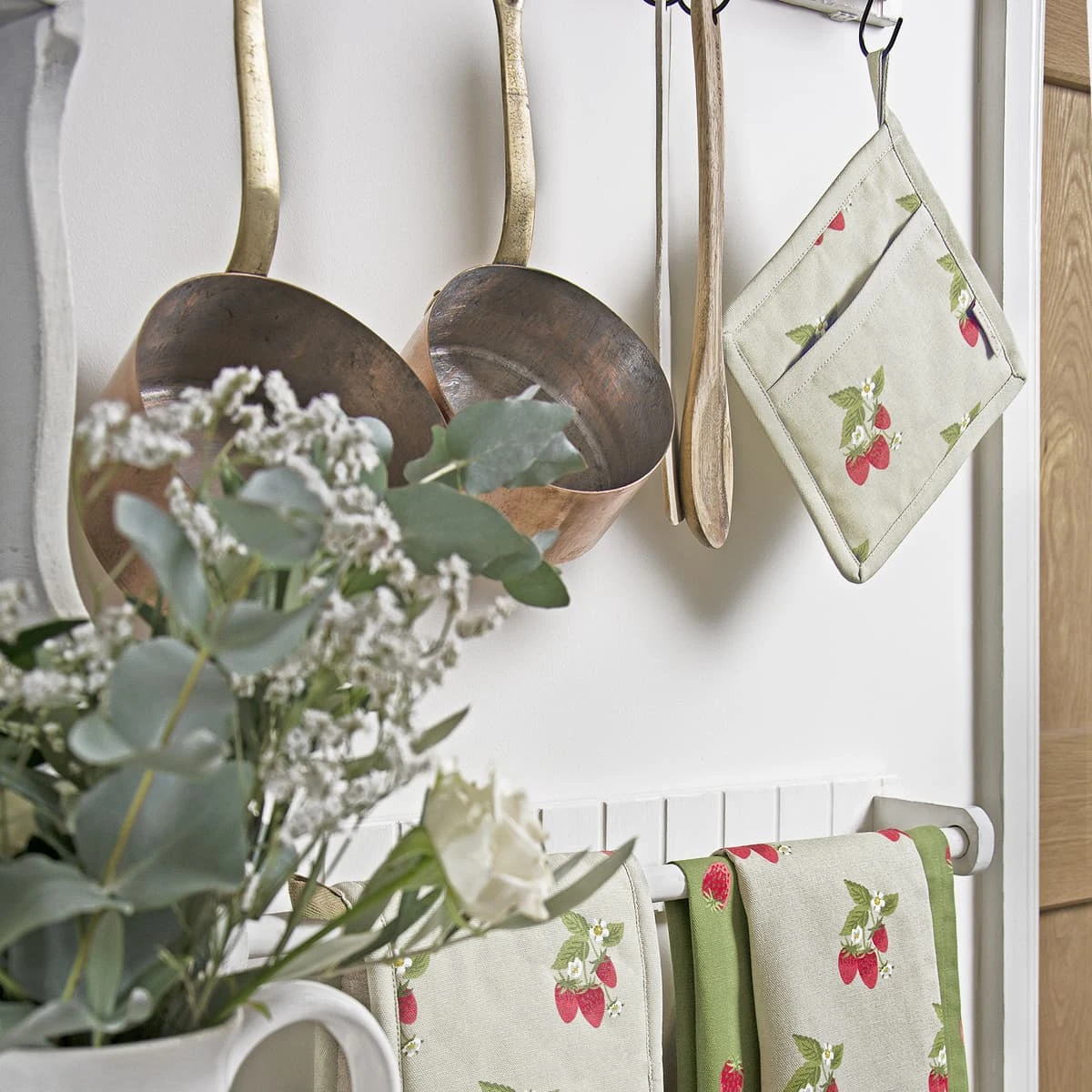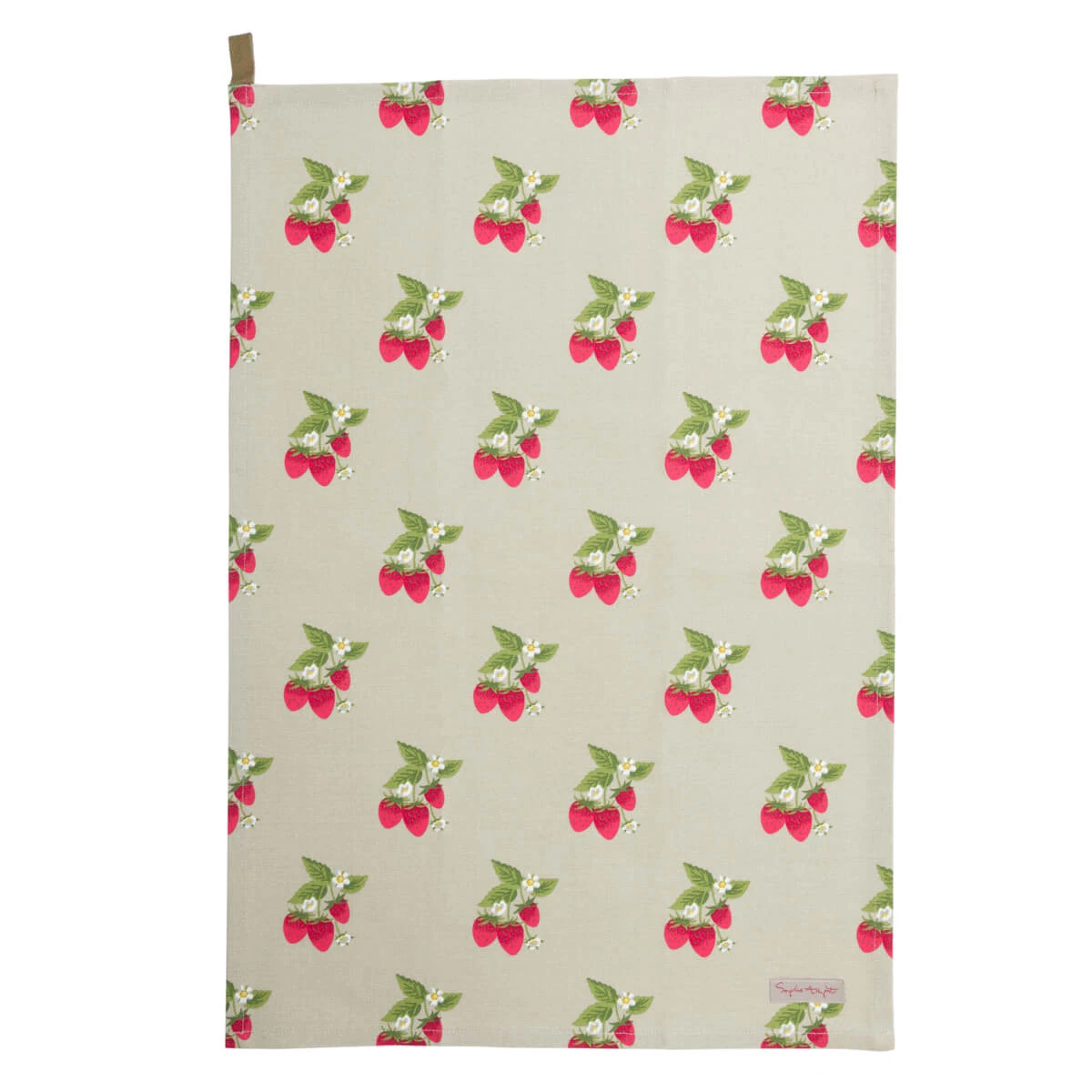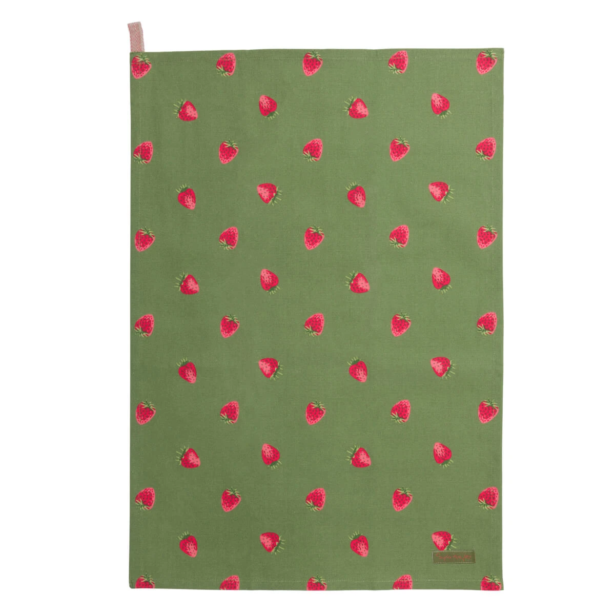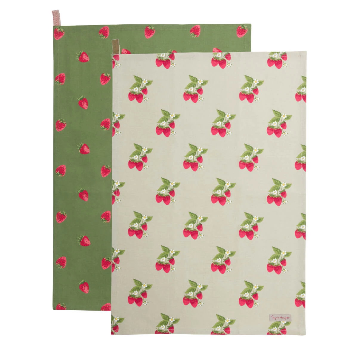 Add a touch of sweetness to your kitchen with these 100% cotton tea towels that come as a set of two. One tea towel features Sophie’s bunches of juicy red strawberries on a green neutral ground, whilst the other is dotted with solo strawberries on a punchy olive ground. This lovely set makes a wonderful gift idea for any home baking enthusiasts! There is a handy ‘loop’ on each top left corner, so you can hang them up in your kitchen.